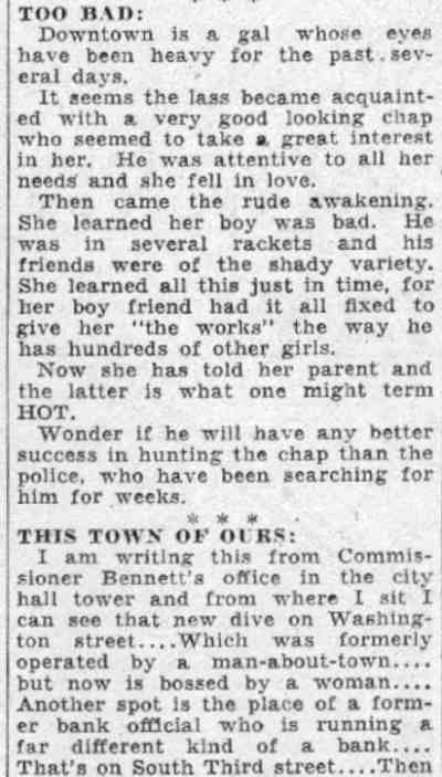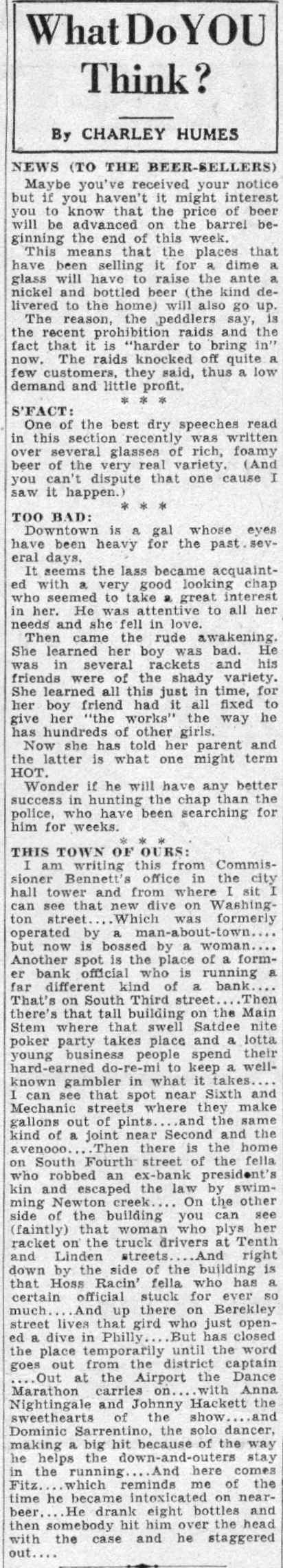 What Do YOU Think? By CHARLEY HUMES THE WAY OF ALL RACKETS Two young men were in the same company in the Army during the World War. Mustered out of service, one of the men, who was the son of a prominent broker, obtained a position for the other. The poor lad made money. He came to Camden with his roll and made his home here. He became a “nickel man" in local craps circles. Soon he was in other rackets and finally became one of the "big shots" in the beer business. He made money and lots of it. He married, built himself a fine home in the suburbs. Then came the depression in the beer market. The government knocking some of our hero's business enterprises for a loop. Frantic and in need of more cash the man turned to the races. There he lost nearly everything he had. Today he is nearly broke, most of his past prestige going with his dough. His pal, the broker's son, stuck to the straight and narrow. Today he is in the same position formerly occupied by his dad. Will he again befriend his buddy of wartime days? It's the only thing that will save the racket guy. And most everybody will know who we mean. * * * We've just been informed our choice bit about that Public Service lass has brought results. The machine is parking in a different spot now. Further down Fifth Street. But what we started out to say was that the wife of the Man in the case and the Boy Friend of the other party are getting wise. In fact one of the aforementioned is Our Informer. And If the Gal and the Man are wise they'll end the thing. Or else- My what a story that'll make! * * * NOW IT'S YOUR TURN All the boys will attend that, celebration tonight, given by Max Schmeling and Bill Morrissey, at Thompson's, in Gloucester … Wonder who that swell looking gal is they've hired as a stenog for the mayor's relief committee this year? … Thanks, F. J. L… Did you know that there are eight candidates for governor at the coming election? .. Or don't you care? … Among the many things we'd like explained is why so many people keep calling in and asking about a dance marathon in town … When, as far as we know, there isn't. … Or, if there is the promoters have had wonderful success in keeping the affair a secret … That blonde is back in Old Marble row again … There's a band of roving Gypsies camped near Bordentown … And do they fleece the suckers at night. … Oh, no! … Somebody told us that .. Aside to our friends of Broadway and Federal- We wonder if the girls involved would kick if we used their names? … What Camden policeman thought his pockets were being picked during a tour of the, state prison yesterday? … And was his face red when he learned his brother officers were playing a joke on him … Yep, Johnny, one of your pals framed that one … We hear that City Detective Johnny (Bumps) Opfer has been suspended from the house committee of the First Ward Republican Club because he made some of his famous snapper soup for another Republican club in town … Your soup’ll taste better'n ever now, Johnny … And every club in the city will request you do them the favor of making some for their members … And the man responsible for your discomfiture has not made any friends by his move… |