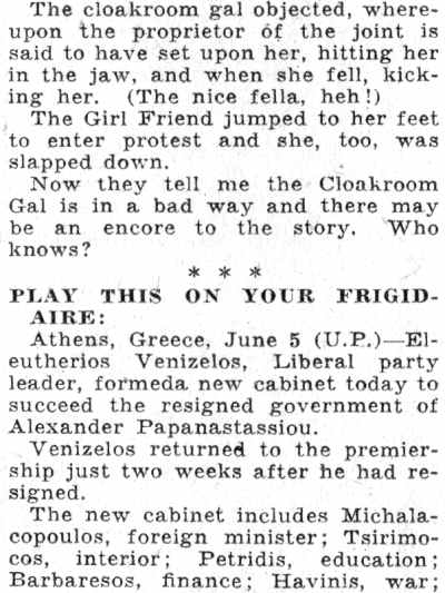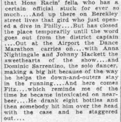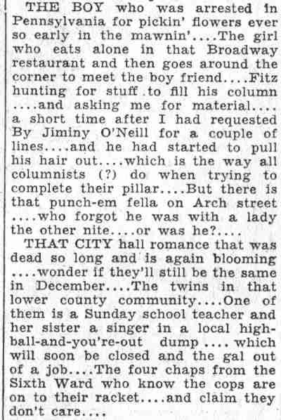 OKAY, ELLIS PARKER, DENY THESE! That Charley Lafferty of Atlantic City will succeed Edward L. Sturgess as Collector of Internal Revenue with offices in the local Federal Building . . . And that that'll be denied by more persons than Ellis Parker too (All right then, you pick Harry L. Maloney, I'll stick to Mrs. Lafferty's boy, Sharlie) . . . That certain investigators for the State Emergency Relief are refusing food orders to families with life insurance policies . . . The chumps making the poor folks turn in their policies for cash and live off that 'til gone . . . :May they bury all such punk investigators in Potter's Field (where they forget to put American flags on graves on Decoration Day) . . . That a Dame downtown who operates One of Those Places refused recently to testify for a lad accused of a holdup because she thought she might have to close her joint (when her testimony would have saved the kid from a long stretch in the Pen, which my friends tell me he didn't have coming) . . . That that member of a suburban school board who recently said certain school was too good for a certain section because everybody living there were swamp dwellers, is knertz . . . And that maybe he'll be singing a different chune following election, the umpchay . . . That there's hoss racin' joints open in at least two political clubs (but that's not half as what they're doing in another political club-but you'll have to go on from there cause I can't tell anymore) . . . That Bill Schultz, local copper, recently plugged a silver half dollar three shots out of three at a distance of skeen-teen feet (much to the dismay of a certain elevator operator who donated the coin) . . . That Philly Sport scribes who recently Okay'd that draw verdict between Johnny Jadick and Johnny Lucas sure had sand in their eyes because Johnny kick'd the daylights out of the reputed Junior Welter Champ (But then a Philly draw is as good as a win anyhow, especially when you're fighting Jadick up in the Cambria. . . That I might as well end this column with Ellis Parker-and tell you that he will deny he has a good clue in the Bradway Brown murder but that he really has a clue and it'll be a honey if it turns out. |