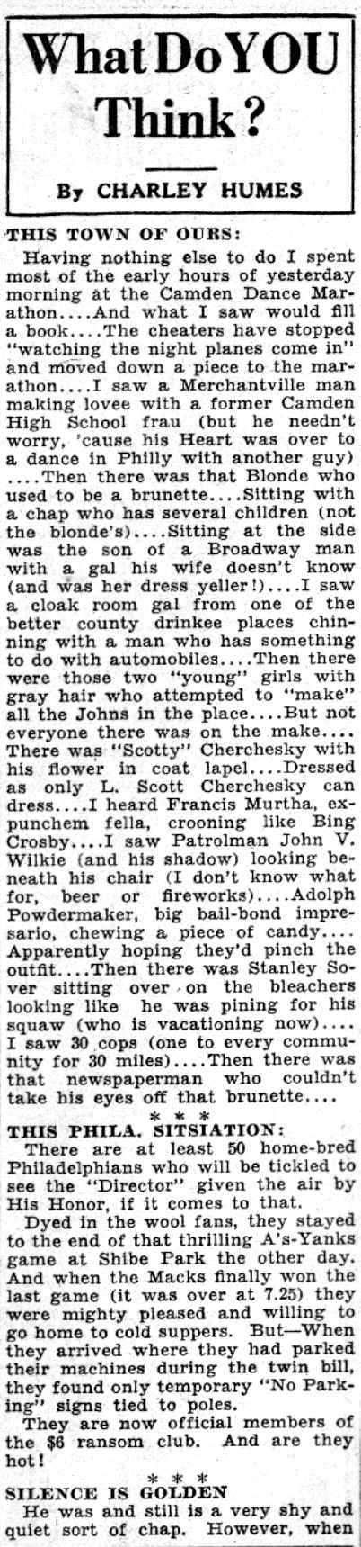 What Do YOU Think? By CHARLEY HUMES HOME, SWEET HOME! (And a trlllion scallions to the mugs who said it wouldn't come back) A two weeks' vacation sure piles up the stuff … Now who'd have thought that North Camden apartment house owner who won't allow children would give the O.K. for dogs in his dingy apartments … A bucket of heat to the chump … Then there is that house on Cooper street which harbors a mother who recently made a personal appearance at several roadhouses while her children were left to roam the streets. There's been a holdup at a certain place recently … And one of the victims was a cop … He had his gun taken away from him. (And failed to report the theft or banditry because the crooks returned the shooter following the affair and the proprietor won't tell because he hasn't his license yet) … It's all around town about that red-headed woman downtown (Yea, you're right, it's a frame house) … Those two ladies from the East Side who took over a certain politician (knowing he couldn't squawk) are all worried because the lad's influence at headquarters is beginning to tell … They tell me there is a dining car owner who totes a girl all the way from Collingswood to a Burlington county watering place for fun (and to get away from the missus)… The same bird recently paid off employees via the small-cost courts … What North Camden girl wears flamingo red (and black) pajamas … Wonder what that gal from Twenty-eighth and Stevens streets is doing lately since that noospaper fella doesn't come around any more (Maybe she gets solace out of that big white pooch, huh?) … There's a justice of the peace in Audubon who holds "regular" court, sometimes with a jury and everything … Camden attorneys recently argued their small-cause cases there… Even Prosecutor Baldwin has spent some of his eloquence before the "squire" … Among the "commuters" every Wednesday and Saturday are "Bo" Lynch, Bill Clisham, who admits he's hanging on the ropes already, and Leon Mickleman. Also comes the tale of that certain gentleman who doesn't like beer and won't drink over half of a glass (except that time a few weeks ago when he attended an affair and the beer was free- he drank 30 glasses and still maintains he doesn't like it) … down in West Collingswood they are calling Ike Hart the "Commodore of Newton Creek" … Maybe it's because of that canoe he paddles about in … Showing the same grit and determination that carried him through battle-scarred France and then on to heavyweight heights, Sergeant Ray Smith attended the Battle of the Maxies in New York last Thursday … . And with a broken back … The Sergeant had to bribe an attendant in a New York hospital to get his clothes for him so that he could get to the affair … And was there, gritting his teeth to hold back the pain, cheering his old friend Jack Dempsey's initial go as a big-time promoter… Now that certain amusements are about ready to fly their kite that certain politician (?) in Pennsauken is about ready to bust right open if he doesn't collect on their successors. Get Joe Feinstein, to explain "if and reverse" bet … And then try and borrow three bucks from him .... Bobby Brest says he will demand a handicap from "District Attorney" Rocco Palese next time they play golf... Rocco winning five out of the last six games but Jack McCarroll says he can take them both if he had two broken arms .... So What Do You Think? |