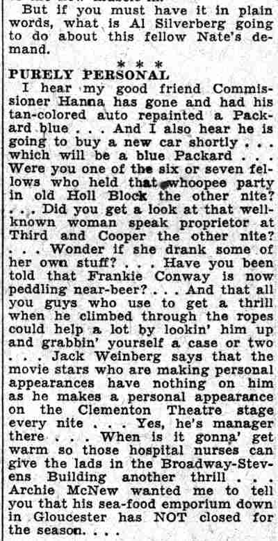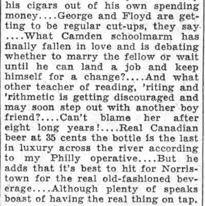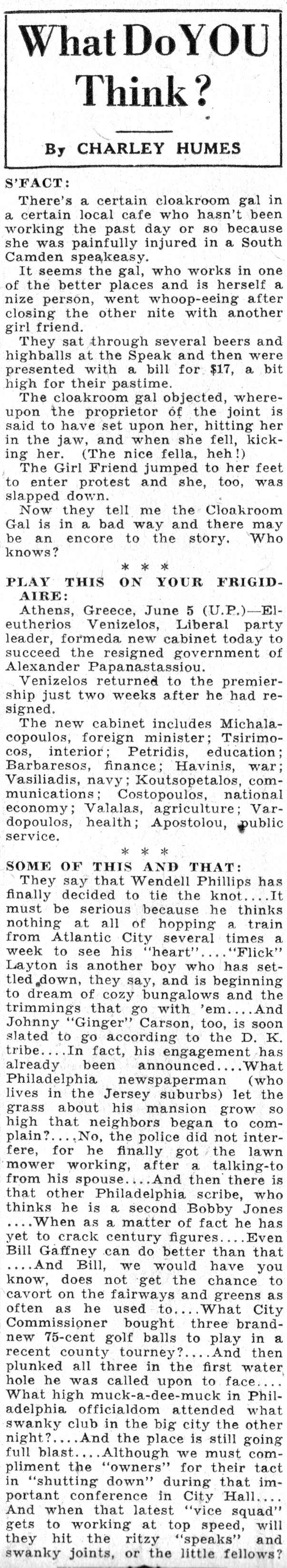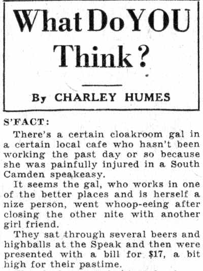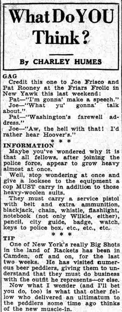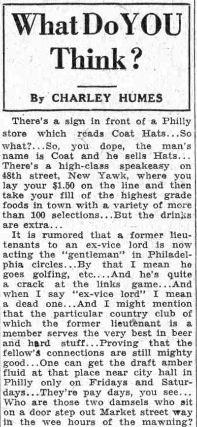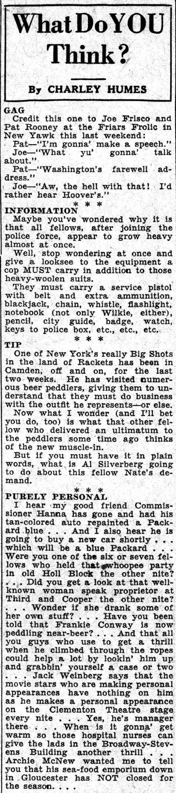 What Do YOU Think? By CHARLEY HUMES PHILADELPHIA BOOTLEGGERS are rejoicing now that the latest attempt by politicians and police to make them pay heavy duties to conduct their business has apparently I been nipped in the bud. You might recall how the 1928 Grand Jury investigation across the bridge revealed a highly organized graft ring among police and politicians. At that time it was the reported custom for a district detective or plain clothes policeman to make the rounds of the bootleggers and cafe proprietors, collect the cut and turn same over to a superior officer for divvy among several persons. Under the plan just halted (or was it) the small ward heel was to take a leading part. Instead of a member of the police department making the collections it was planned to send the division leader, or one of his hirelings, to collect the duty. Bootleggers claim they can sell their stuff $3 to $5 a gallon cheaper if organized graft is repulsed and they don't have to make weekly payments to police. * * * Well, sir, it happened. That First Ward Politician and myself have met. And a lot of differences have been ironed out. The occasion was Johnny Daly's big blowout the other nite. And did the crowd cheer when he walked up and shook my hand. Now we're both gonna wear a white carnation at that big pig roast at the First Ward Club on March 27. * * * Have you heard about that Camden fireman who intends to get married shortly and not tell his buddies anything about it. … when as a matter of fact they know already … Freddy Tooley is all bronzed up now…Maybe that "red-head" has some-thing to do with it. … Skip Gardner is buying raw steaks now … What Camden hairdresser and Newark attorney are planning to go around with each other steady? … Johnny Murphy was telling me about some fellow who wanted to get his name in here but I can't seem to remember the name … Mt. Holly had the flags out when Russell "Hop" Stoddard returned from Hopewell the other day · … They were starting a business drive, you nut. … Detective Benjamin Simon recently lost two gold teeth on a small bridge … And with crime at a minimum the past week the entire detective force have been invoked in the search for them … I wonder if Johnny Opfer is gonna make any of his famous snapper soup for the First Ward pig roast? … There's a budding romance on the top floor of one of the city's skyscrapers (There's only three you know, so that ought to be easy) … I've been told about a recent offer of $150 to three children of a man killed in the line of duty … This is in full settlement for the man's death, which came by no fault of his own … I'm wondering if the company making the offer can really afford it … Even though it will be denied Philly is wide open … And beer as plentiful there as in Camden … What Philadelphia councilman staged a wide-open party at a certain Republican club Thursday night … And transported the entire ensemble of a Philadelphia burlesk house to the place for his guests entertainment. … See you later. |