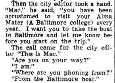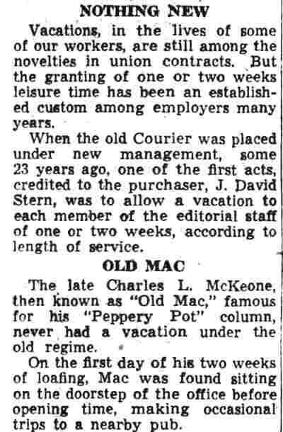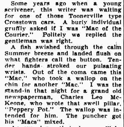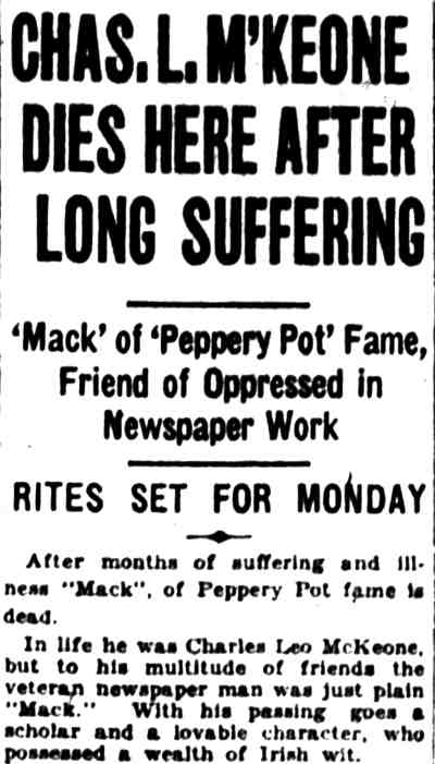 Not forgetting a friend since boyhood days as an embryo news gatherer— the revered charles leo mckeone, of "peppery pot" fame. Back in the days when this young scrivener wrote one of the pioneer columns, "The Razzberry Chorus", it was "Old Mac" who when meeting him on our Police Court beat would chuckle at something we had written. They were days when we sported those tortoise shell spectacles and our hirsutal adornment consisted of a wavy, pompadour. Mac repeating our resemblance to Harold Lloyd, the screen comic who was then earning possibly $100,000 a year and our pay check was for all of $15. |