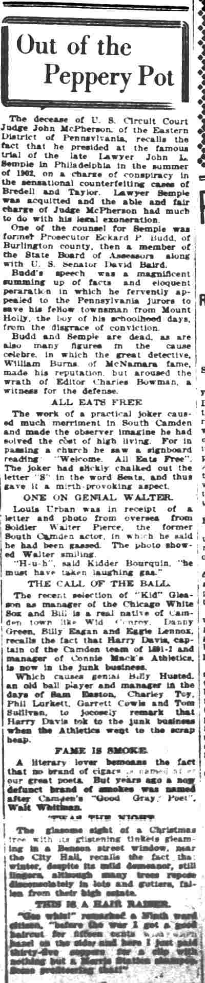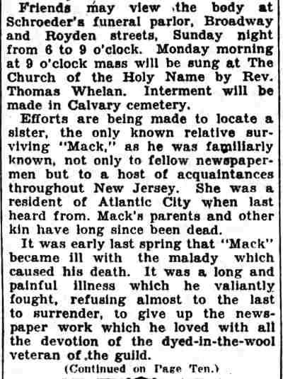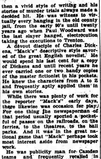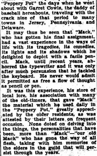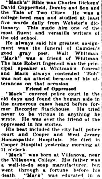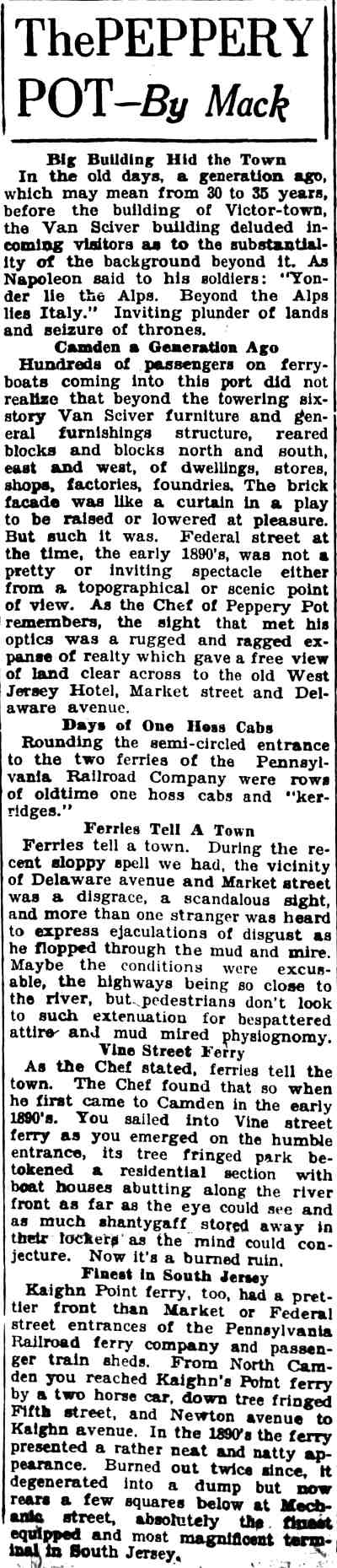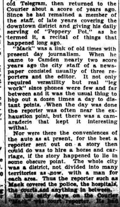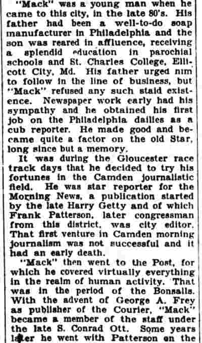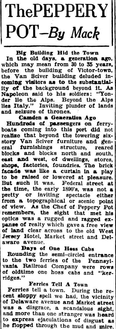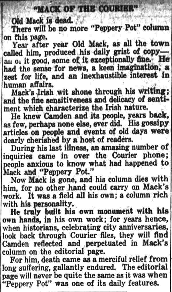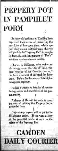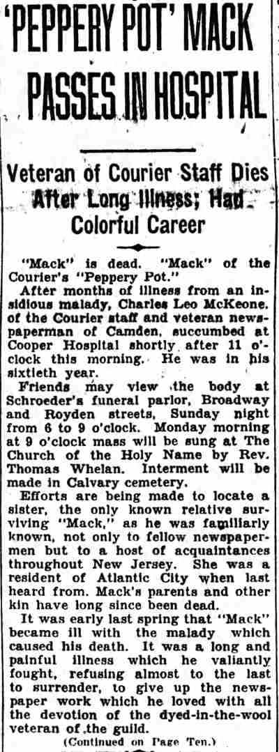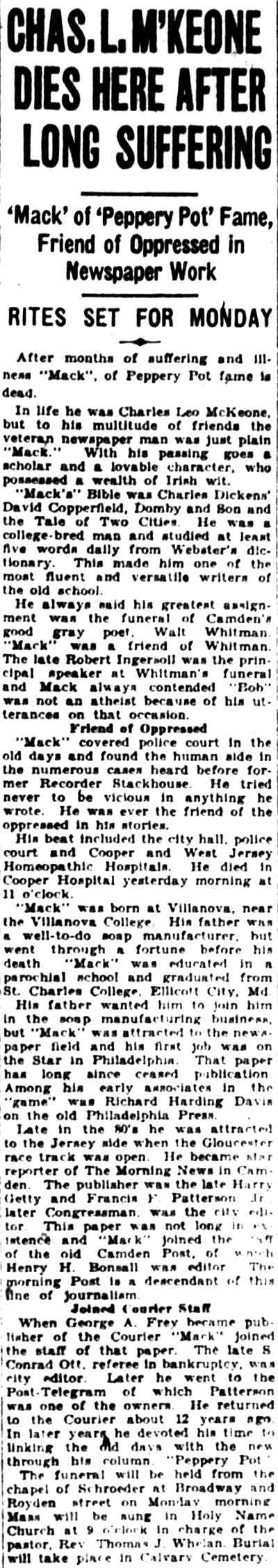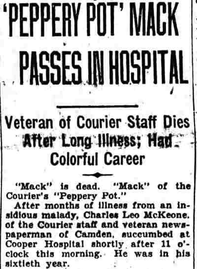 CHARLES LEO McKEONE was a well-known and much loved reporter in Camden, whose career spanned four decades. He was born in Philadelphia in 1867 and first started in journalism there. His father, Irish born Charles McKeone, was a graduate of Trinity College in Dublin who had come to Philadelphia and became wealthy as a soap manufacturer. The elder McKeone, in his later years, dabbled in journalism and as a war correspondent, wrote for The Freeman's Journal from India and Sudan. Charles Leo McKeone was afforded a college education but did not follow his father's wished to go into business. Instead he followed the path of the reporter, fist in Philadelphia. He came to Camden in the late 1880s and wrote at one time or another for all of the major daily papers in the city, The Post, The Daily Telegram, The Post-Telegram, The Daily Courier, and in the last year of his life after the acquisition of the Post-Telegram by the Courier, the Courier-Post, which published two editions, the Morning Post and the Evening Courier. In the late 1910s… the first found as of this writing is from January of 1919… Charles L. McKeone began writing a column called "Out of the Peppery Pot", which soon became a daily feature. He was soon given the "by Mack" by-line for his column. In December of 1920 or January of 1921 the column became "The Peppery Pot- By Mack". He also wrote a column from 1925 to 1927 called "Do You Remember" recounting events that happened 20 years previously. The Peppery Pot was filled with McKeone's reminisces of bygone days in Camden. As his obituary, which is immediately below, relates, he covered everything from sports to hangings, was well known and knew just about everybody. The Peppery Pot set the example for a host of men whose writings about Camden's past graced the Courier-Post for the next 83 years, including Ben Courter, dan mcconnell, Frank Sheridan, charley humes, James O'Neill, Stephen O'Keefe, and Tom Bergbauer, whose last column appeared in 2010. Charles L. McKeone passed away on December 16, 1927 at Cooper Hospital, he had been ill and in pain for quite some time, but had continued writing his daily column until shortly before his death, with one appearing on December 7, 1927. As no papers from the next 8 days are currently on-line, it is not know n if that was the last "Peppery Pot". What is known is that when it did not appear, the Courier-Post received many inquiries as to where their beloved Peppery Pot was. Charles
