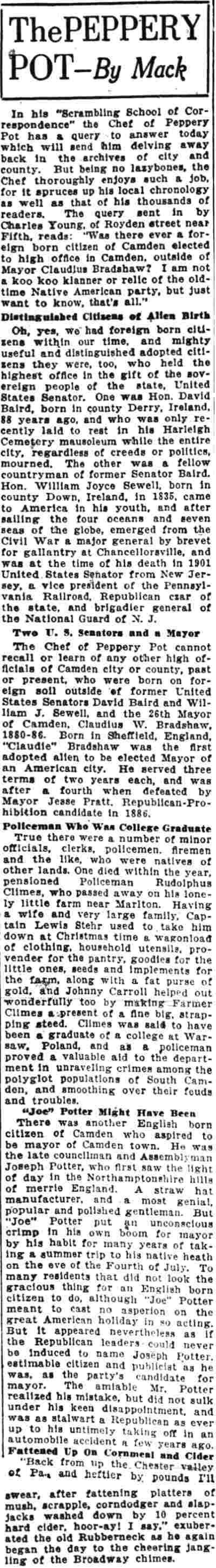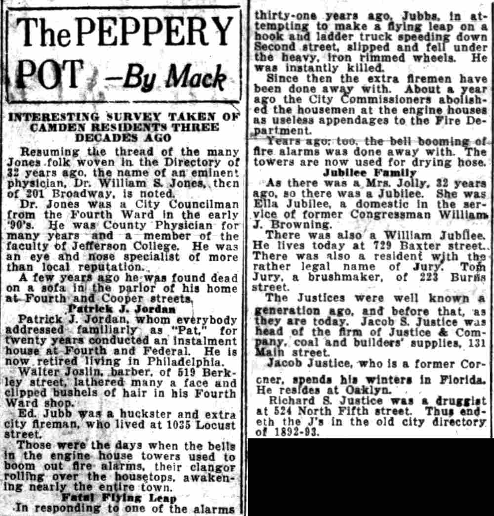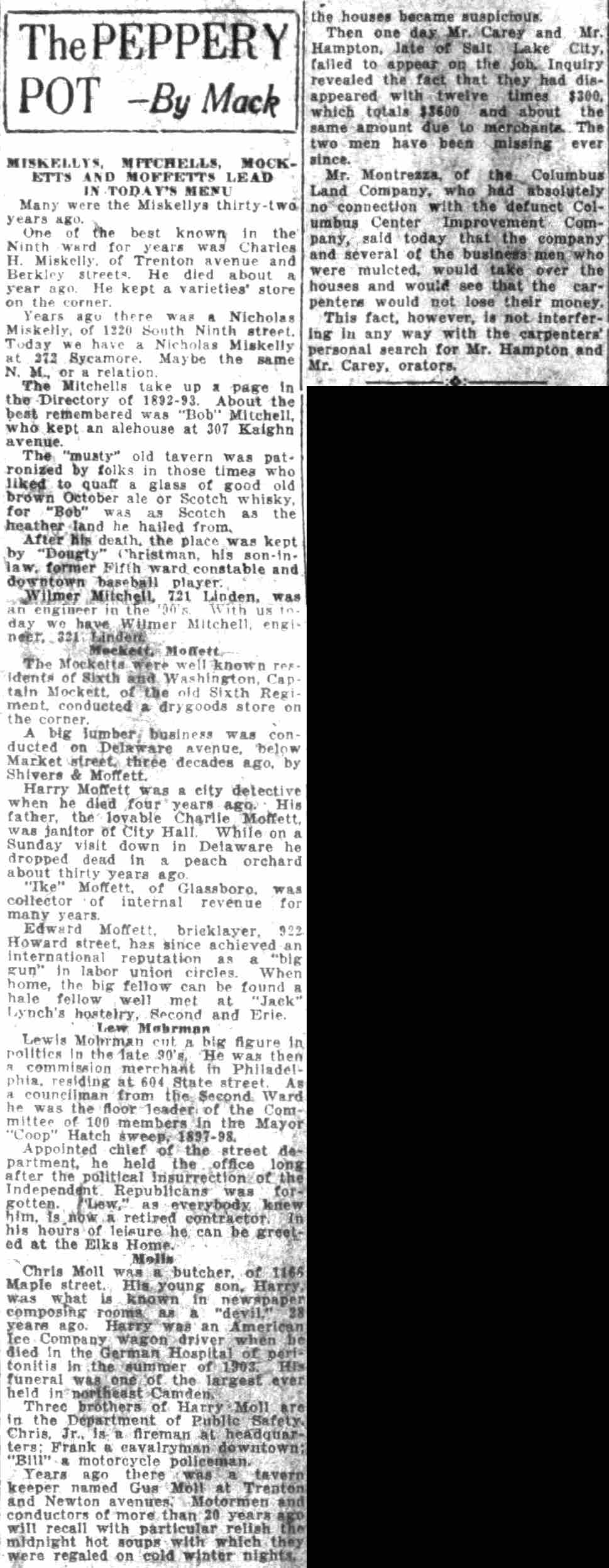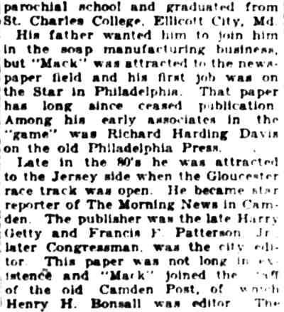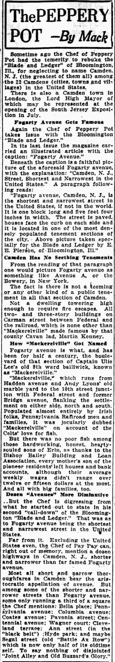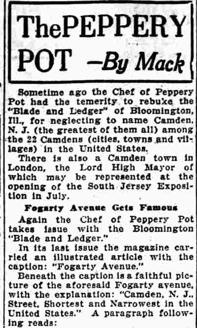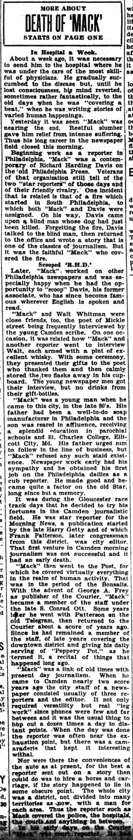 CHARLES LEO McKEONE was a well-known and much loved reporter in Camden, whose career spanned four decades. He was born in Philadelphia in 1867 and first started in journalism there. His father, Irish born Charles McKeone, was a graduate of Trinity College in Dublin who had come to Philadelphia and became wealthy as a soap manufacturer. The elder McKeone, in his later years, dabbled in journalism and as a war correspondent, wrote for The Freeman's Journal from India and Sudan. Charles Leo McKeone was afforded a college education but did not follow his father's wished to go into business. Instead he followed the path of the reporter, fist in Philadelphia. He came to Camden in the late 1880s and wrote at one time or another for all of the major daily papers in the city, The Post, The Daily Telegram, The Post-Telegram, The Daily Courier, and in the last year of his life after the acquisition of the Post-Telegram by the Courier, the Courier-Post, which published two editions, the Morning Post and the Evening Courier. In the late 1910s… the first found as of this writing is from January of 1919… Charles L. McKeone began writing a column called "Out of the Peppery Pot", which soon became a daily feature. He was soon given the "by Mack" by-line for his column. In December of 1920 or January of 1921 the column became "The Peppery Pot- By Mack". He also wrote a column from 1925 to 1927 called "Do You Remember" recounting events that happened 20 years previously. The Peppery Pot was filled with McKeone's reminisces of bygone days in Camden. As his obituary, which is immediately below, relates, he covered everything from sports to hangings, was well known and knew just about everybody. The Peppery Pot set the example for a host of men whose writings about Camden's past graced the Courier-Post for the next 83 years, including Ben Courter, dan mcconnell, Frank Sheridan, charley humes, James O'Neill, Stephen O'Keefe, and Tom Bergbauer, whose last column appeared in 2010. Charles L. McKeone passed away on December 16, 1927 at Cooper Hospital, he had been ill and in pain for quite some time, but had continued writing his daily column until shortly before his death, with one appearing on December 7, 1927. As no papers from the next 8 days are currently on-line, it is not know n if that was the last "Peppery Pot". What is known is that when it did not appear, the Courier-Post received many inquiries as to where their beloved Peppery Pot was. Charles