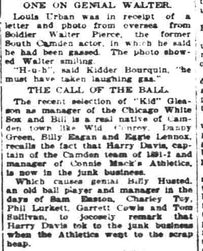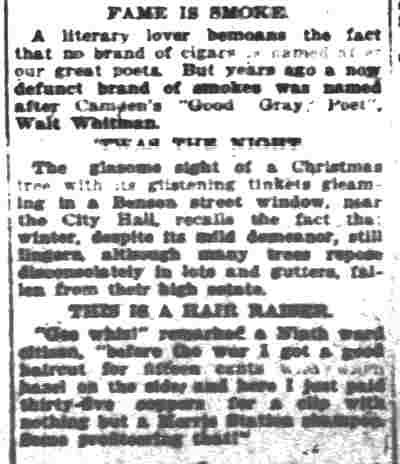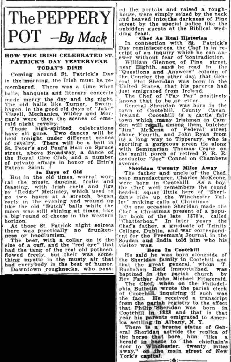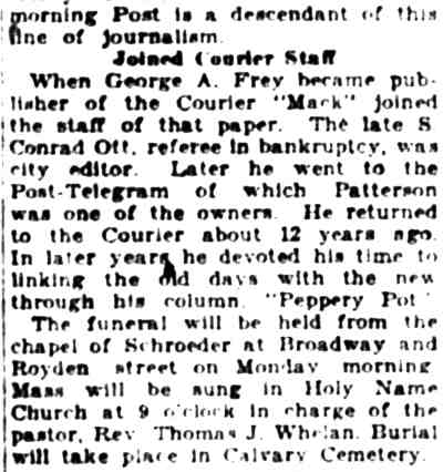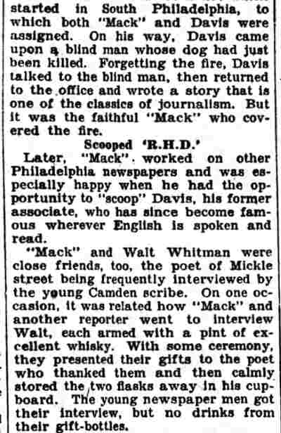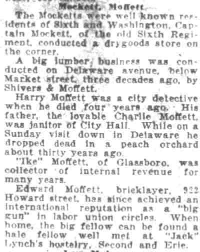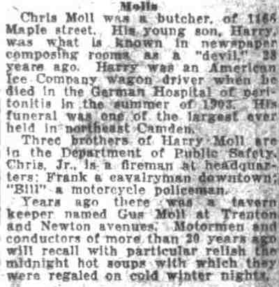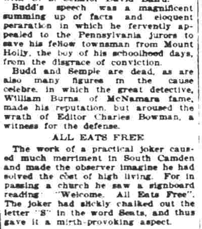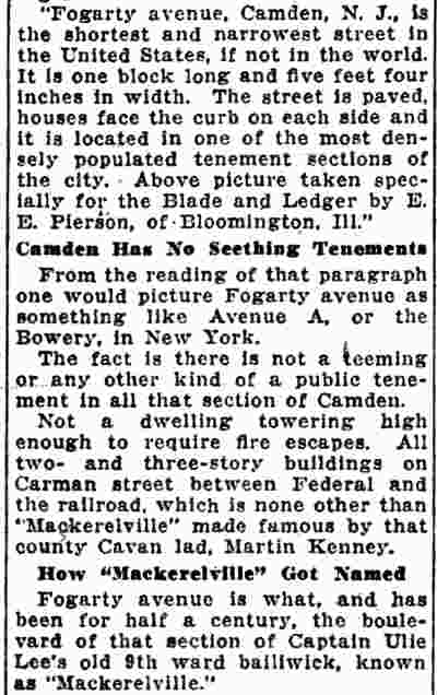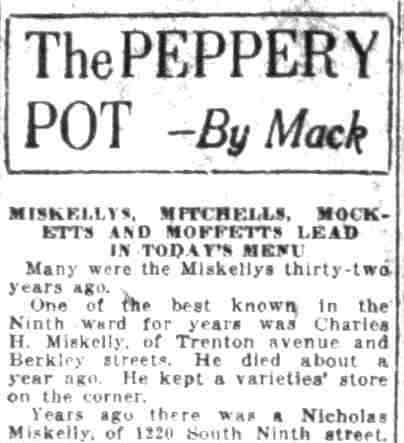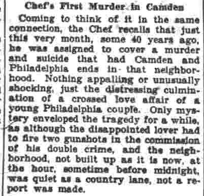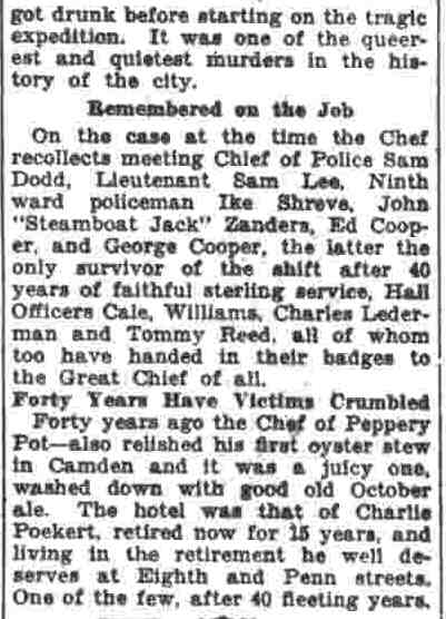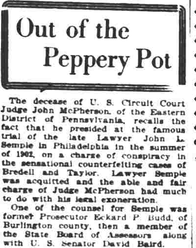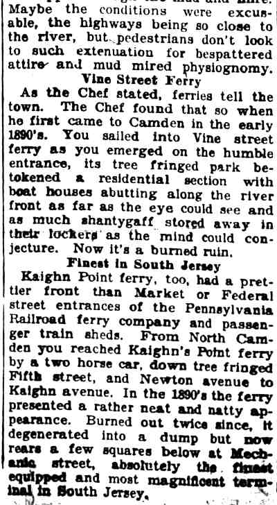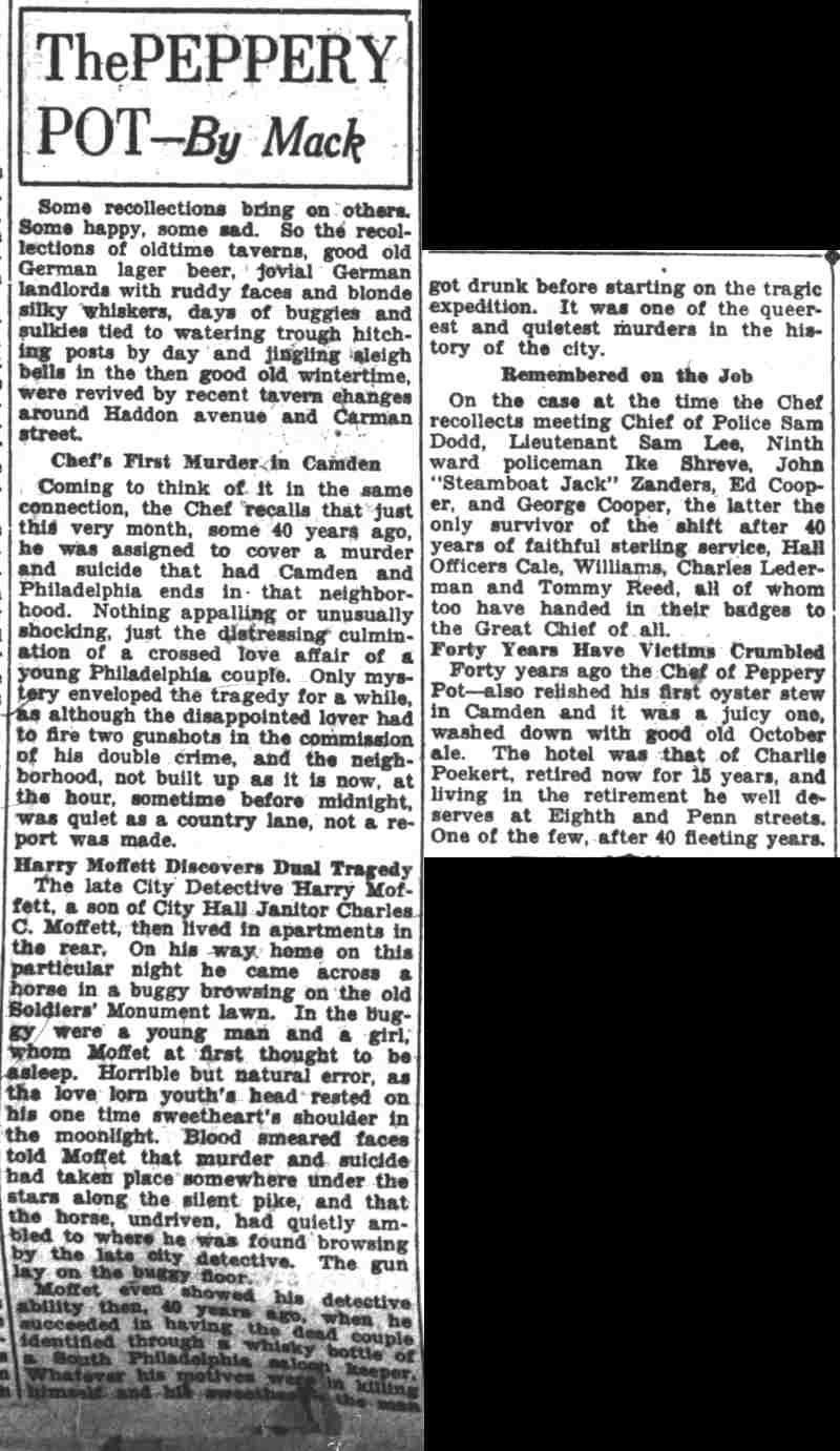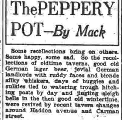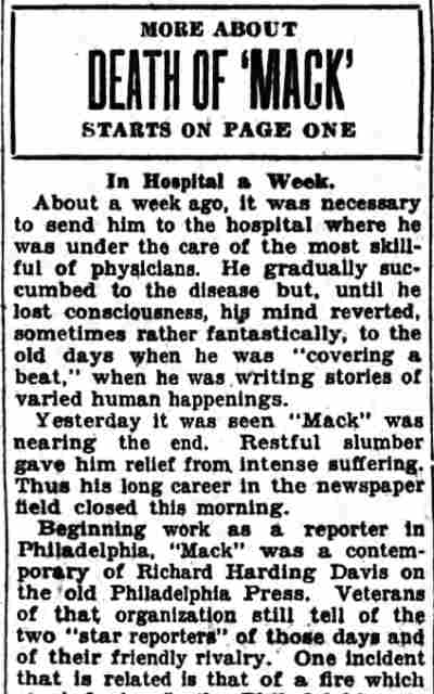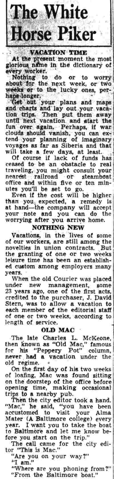 CHARLES LEO McKEONE was a well-known and much loved reporter in Camden, whose career spanned four decades. He was born in Philadelphia in 1867 and first started in journalism there. His father, Irish born Charles McKeone, was a graduate of Trinity College in Dublin who had come to Philadelphia and became wealthy as a soap manufacturer. The elder McKeone, in his later years, dabbled in journalism and as a war correspondent, wrote for The Freeman's Journal from India and Sudan. Charles Leo McKeone was afforded a college education but did not follow his father's wished to go into business. Instead he followed the path of the reporter, fist in Philadelphia. He came to Camden in the late 1880s and wrote at one time or another for all of the major daily papers in the city, The Post, The Daily Telegram, The Post-Telegram, The Daily Courier, and in the last year of his life after the acquisition of the Post-Telegram by the Courier, the Courier-Post, which published two editions, the Morning Post and the Evening Courier. In the late 1910s… the first found as of this writing is from January of 1919… Charles L. McKeone began writing a column called "Out of the Peppery Pot", which soon became a daily feature. He was soon given the "by Mack" by-line for his column. In December of 1920 or January of 1921 the column became "The Peppery Pot- By Mack". He also wrote a column from 1925 to 1927 called "Do You Remember" recounting events that happened 20 years previously. The Peppery Pot was filled with McKeone's reminisces of bygone days in Camden. As his obituary, which is immediately below, relates, he covered everything from sports to hangings, was well known and knew just about everybody. The Peppery Pot set the example for a host of men whose writings about Camden's past graced the Courier-Post for the next 83 years, including Ben Courter, dan mcconnell, Frank Sheridan, charley humes, James O'Neill, Stephen O'Keefe, and Tom Bergbauer, whose last column appeared in 2010. Charles L. McKeone passed away on December 16, 1927 at Cooper Hospital, he had been ill and in pain for quite some time, but had continued writing his daily column until shortly before his death, with one appearing on December 7, 1927. As no papers from the next 8 days are currently on-line, it is not know n if that was the last "Peppery Pot". What is known is that when it did not appear, the Courier-Post received many inquiries as to where their beloved Peppery Pot was. Charles