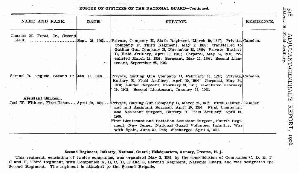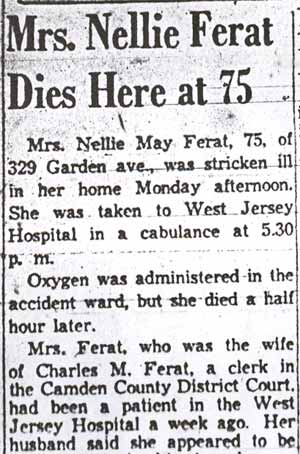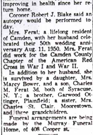 CHARLES MITCHELL FERAT JR. was the firstborn child of Charles M. Ferat and his wife, the former Mary A. Wrifford. He was born on August 17th of 1878 in Camden NJ, where his father was in the candy business at 421 Federal Street, this business was founded by his grandfather, also named Charles Ferat. Born in France and a veteran of the Civil War, grandfather Ferat went into the practice of medicine in the 1870s, with his home and office at 405 Broadway. In late 1887 or early 1888 the Ferat family then moved to 26 Hudson Street. By 1900 the family and the business later moved to 526 Federal Street. His younger brother, Edward "Eddie" Cummings Ferat was quite well known as a professional basketball player, and was a member of the 1903-04 National Basket Ball League champion Camden Electrics. There were two other Ferat children, William and Helene. On On March 19, 1897 Charles Ferat enlisted in the New Jersey National Guard. He resigned as a First Lieutenant in 1916. He re-enlisted in May of 1917 and by 1927 he had risen to the rank of Captain. Charles Ferat married Nellie Ottinger on August 11, 1900. There were two children, a daughter, Ruth, and a son Charles M. Ferat 3rd. Charles and Nellie Ferat were living at 628 Berkley Street in September of 1918, when he registered for the draft, He was then working at the New York Shipbuilding Company shipyards. After the war Charles Ferat worked at City Hall, and for many years as a clerk in the Camden County District Court. Daughter Ruth Ferat married Marcy Bower and moved to Syracuse, New York. For many years Charles Ferat Jr. lived at 329 Garden Avenue in East Camden, a few minutes walk from his brother edward ferat, who lived at 63 South 29th Street. Edward Ferat passed away on May 7, 1950. Nellie Ferat died on February 1, 1954, Charles Ferat Jr. was still alive and living in East Camden when his wife passed. Sometime thereafter he moved to Syracuse NY, where son Charles Ferat III lived. Charles Ferat Jr., last a resident of Syracuse NY, died in July of 1969 at the age of 90 years. |
