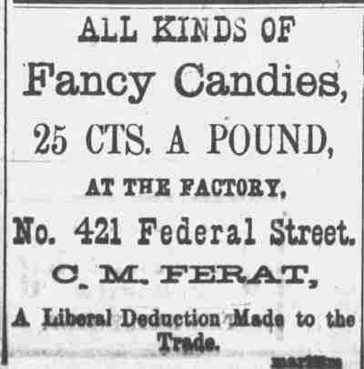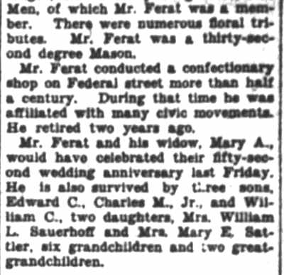 In 1876 Charles M. Ferat Sr. opened a business as a candy manufacturer at 421 Federal Street. Charles M. Ferat Sr. married Marry Wrifford on November 29, 1877 at the Third Street Methodist Episcopal Church. Five children were born of this marriage. Charles M. Ferat Jr., Edward "Eddie" Cummings Ferat, William C. Ferat, Helene Ferat, and Mary E. Ferat.