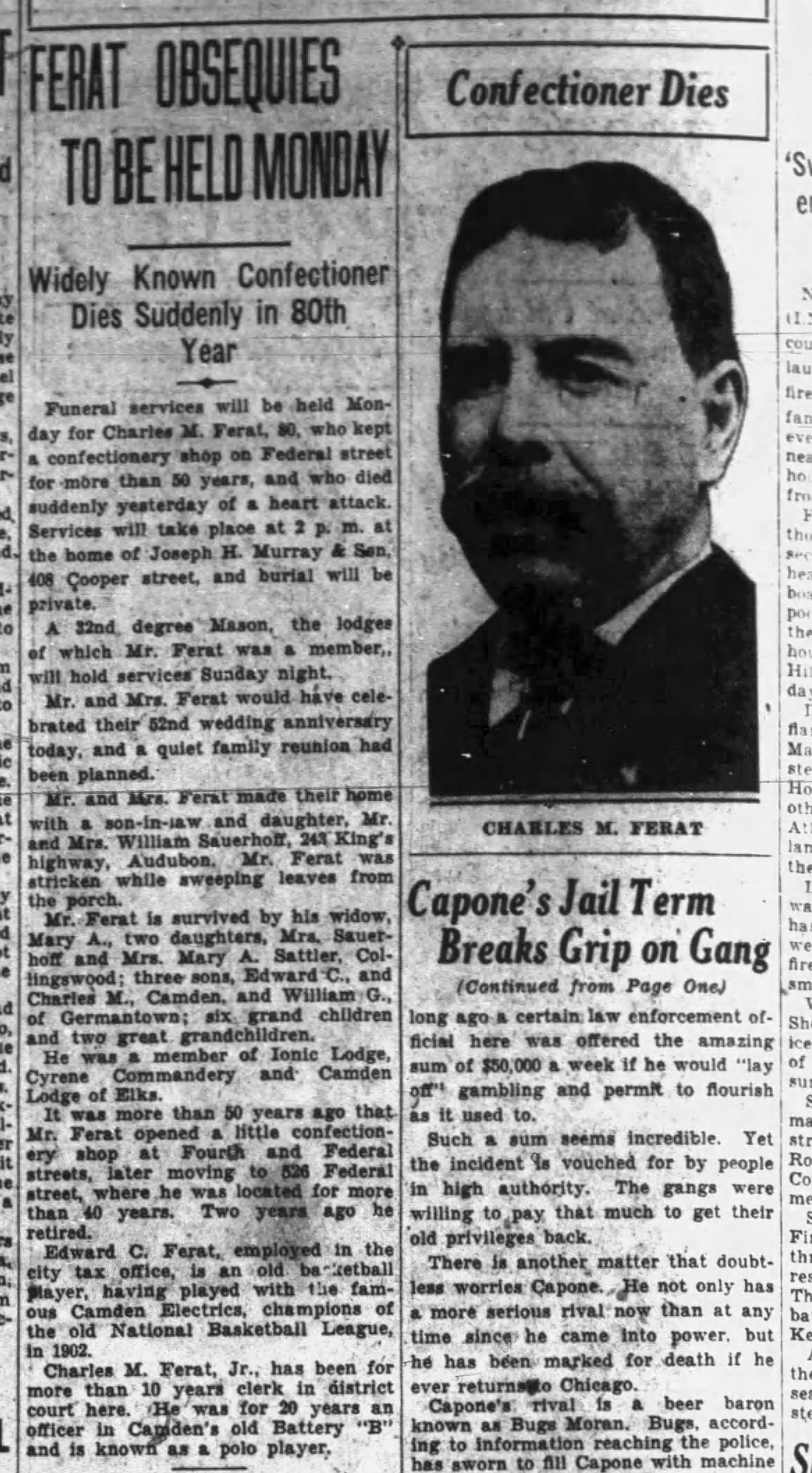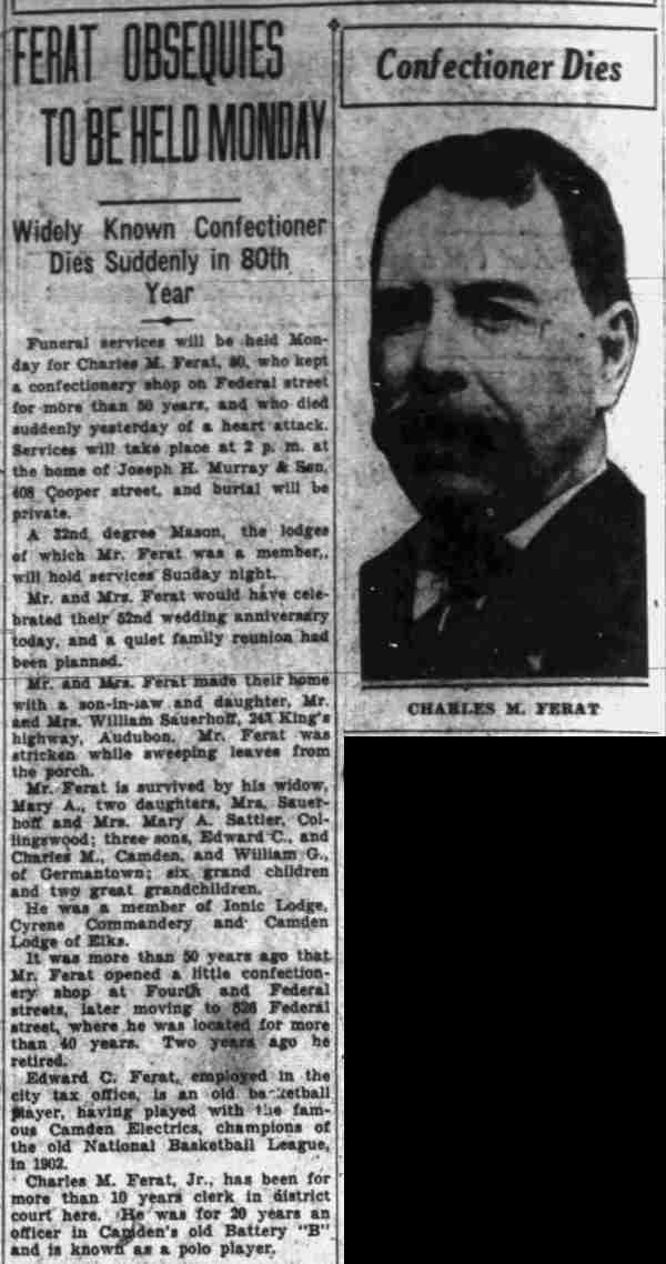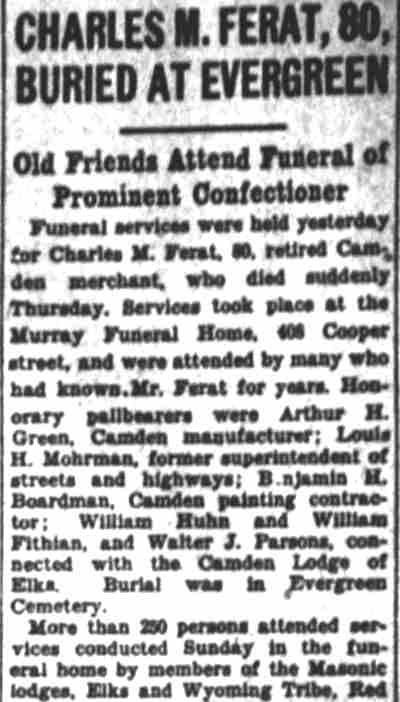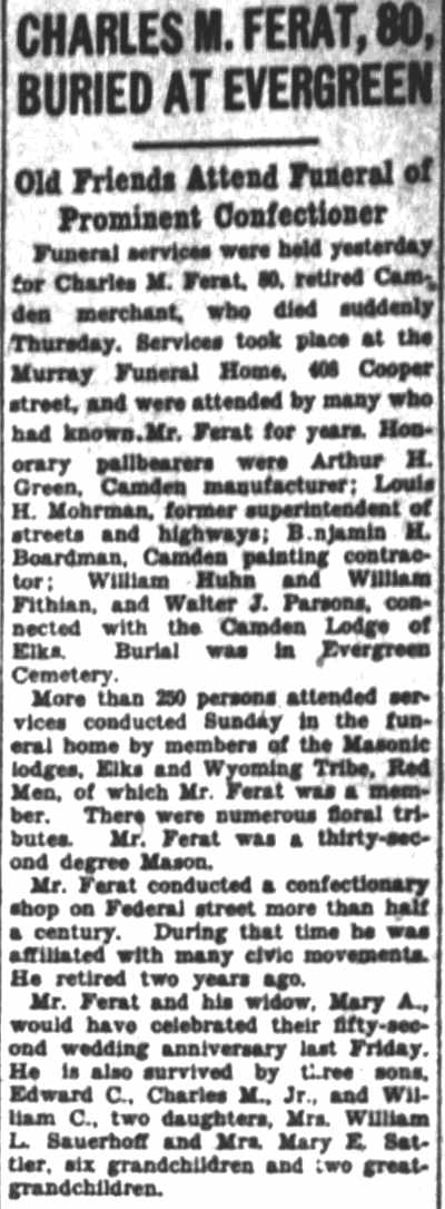 Son Charles M. Ferat Jr. married Nellie Ottinger on August 11, 1900. There were two children, a daughter, Ruth, and a son Charles M. Ferat III. Charles and Nellie Ferat were living at 628 Berkley Street in September of 1918, when he registered for the draft, He was then working at the New York Shipbuilding Company shipyards. After the war Charles M. Ferat Jr. worked at City Hall, and for many years as a clerk in the Camden County District Court.