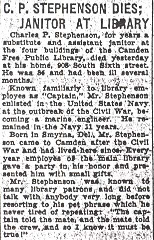 CHARLES P. STEPHENSON was a Naval veteran of the Civil War, best remembered for his work as the janitor of the Free Public Library at Broadway and Clinton Streets in the 1920s and early 1930s. The 1900 Census shows Charles P. Stephenson at 1504 Federal Street, where he lived with his wife Sarah and children Mary, David, Sarah, Charles, Alfred, William, and Cora. 1906 City Directory shows Charles P. at 819 Market Street. Charles P. Stephenson lived with his wife Sarah at 706 Federal Street and son Charles P. Jr. when the 1914 City Directory was compiled. By 1924 he had moved ot 908 South 6th Street, where he resided until his death in October of 1933. |