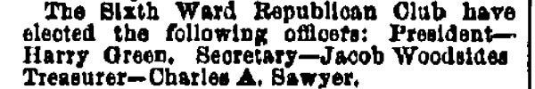In the shrievalty scrap of 1881. Gibbs received 5381 and Morgan, 1189. Angus Camerson, the Democratic candidate was given 4450 votes. Nor did the "true" nominees for coroner fare any better. Sam Bennett, William Thompson and Alexander Powell being defeated by 'Doc' John D. Leckner, Jacob Justice and William Duble.
