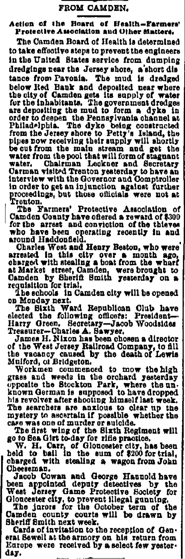 And all 29 of these valiant Republicans voted for Eli B. Morgan as their candidate for sheriff. You old timers will be interested in recalling these delegates who refused to kowtow to 'Colonel Jim.' In the Third ward there was James M. Lane, Charles S. Cotting and George Martin, in the Fourth, Husted, the Sixth, C. C. Smith, Thad Varney, Charles A. Sawyer; in the Seventh, Stephen Walters, Charles Lederman, William Simpson; in Gloucester, John W. Wright, David Anderson, Frank Mills, Robert Lafferty, Richard Allen, Jesse Daisey, Samuel Wood; in Haddon, Charles M. Macready, Elwood J. Haines: in Delaware, William Brick, William Graff, Isaac Coles; in Merchantville, Matthias Homer, William Naylor, and in Center, James Davis, Garrett Patton and Gilbert Shaw.
