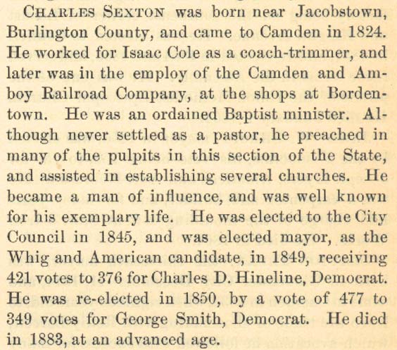 REV. CHARLES SEXTON was born in Jacobstown, in Burlington County. He came to Camden NJ in 1824, first working for Isaac Cole as a coach-trimmer, and later in the car shops of the Camden & Amboy Railroad in Bordentown NJ. An ordained Baptist Minister, he preached all over the state, and was instrumental in the founding of several churches. He was married to Anna Bryan who bore him three children, Anna, Caroline, and Mahlon. Charles Sexton became involved in local politics, and was elected to city council in 1845. In 1849 he was elected mayor, defeating journalist Charles D. Hineline. He was re-elected in 1850. He left the Mayor's office in 1851, succeeded by Lorenzo F. Fisler. The 1870 Census shows Charles and Anna Sexton living in Camden's Middle Ward. When Trinity Baptist Church was organized in December of 1871 Rev. Sexton and his wife were among the original members. Anna Bryan Sexton passed away in 1872. The 1872 Directory shows Charles Sexton and his son Mahlon, a bookkeeper, living at 208 Plum Street (later renamed Arch Street). By the time the Census was taken in 1880, Rev. Sexton, suffering from the effects of old age, was living at the Old Man's Home in the 3900 block of Powelton Avenue in Philadelphia, Pennsylvania. Charles Sexton passed away on June 21, 1883 and buried at Mt. Moriah Cemetery in Philadelphia. |