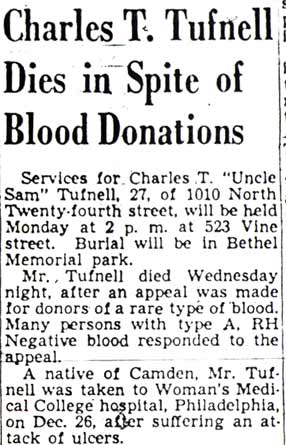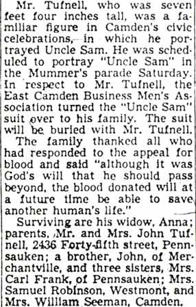 CHARLES T. TUFNELL was born in Camden NJ in 1922 to John and Martha Tufnell. His father had been born in England in 1890. Charles Tufnell was the youngest of five children. Growing to a height of 7'4", Charles Tufnell was a familiar figure in Camden. He portrayed Uncle Sam in many Camden parades and civic events. He also portrayed Uncle Sam in the Mummer's Parade in Philadelphia. He married and lived with his wife Anna at 1010 North 24th Street in Camden's Cramer Hill neighborhood. On December 26, he was taken to the hospital suffering from bleeding ulcers. Despite blood transfusions, he died on January 4, 1950. Charles T. Tufnell was buried in the Uncle Sam suit that he had worn while taking part in Camden's community events on January 9, 1950 at Bethel Memorial Park in Pennsauken NJ. He was survived his wife, Anna Tufnell, his parents, brother, and sisters. His parents were at that time living in Pennsauken NJ. His father later moved to the Westfield Acres public housing project in Camden, where he lived until 1970. |