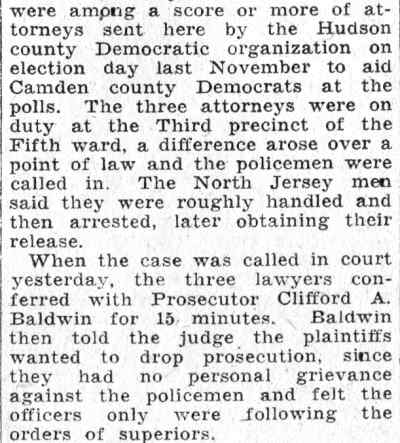 "Realizing the utter futility of their efforts to elect David Baird to the governorship, the Republican party in Camden County is resorting to every contemptible means at its com-mand to intimidate the voters." This declaration was made last night by Miss Marie V. Kelly, former jury commissioner, at a meeting of 200 voters in the Fourth Ward Democratic Club, 455 Berkley Street. "At a meeting of election officers," Miss Kelly said, "William E. A. King, a member of the county board of elections sworn to preserve the sanctity of the ballot box, told these officers that the Republican party has promised Baird a 50,000 majority in Camden County and that they were to get the votes no matter how they got them and that they would be protected. He told them if the Democrats interfered that the Republican police would take care of the Democrats. "Today Major Dickinson, deputy director of public safety, raised a false howl of gunmen to come here to make a rough house of the city. We know that this is weak propaganda to cover what the Republicans intend to do.” Points to Murder "Mr. Dickinson has evidently forgotten the murder committed at Third and Benson Streets on the eve of the city election in May by gunmen imported by the Republican workers to intimidate the voters of that ward- gunmen who remain uncaught and unpunished to this day. “The most flagrant act on the part of the Republican Party is the removal of the polling place yesterday from the fourth district of the fourth ward from the E. A. Stevens School on Fourth Street to a private residence on Berkley Street. The polling place has been in the school for a number of years and no complaints had been made by Democratic members of the elections board. This change has been made without a meeting of the county elections board.' "Frank Albright, city clerk, took it upon himself to make the change, basing his action on the statement the school was totally unfit for the board to sit in for a day to conduct the business of election.” 'Refreshment' cited "However, school children are forced to use this building every day of the school year. The residence to which the polling place has been transferred was reconditioned so that it could be used. The real reason for this change was that it will be much easier to dispense liquid refreshment in a private home than in a public school. "It is a. fine state of affairs when the people are called on to build a $10,000,000 city hall within six blocks of a school where children are forced to occupy a school which the city clerk says is in a horrible condition and totally unfit for use. "I urge the people in the third and fourth wards of Camden to rise in revolt against the Republican organization that is trying by every means to prevent an honest exercise of the franchise at the polls on Tuesday. The protest must be registered by marking every blank on the ballot under the Democratic column". |