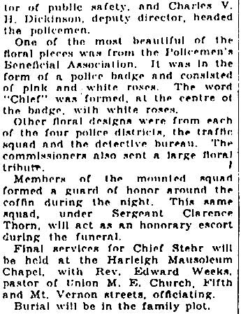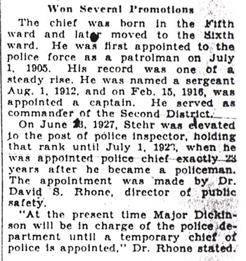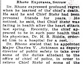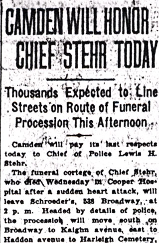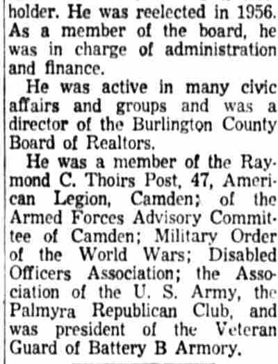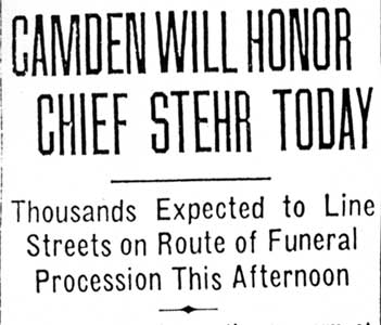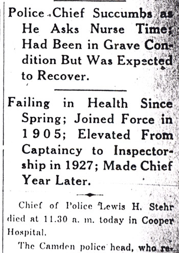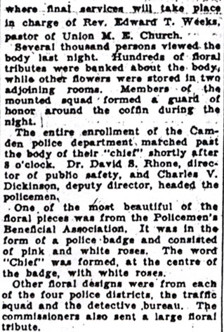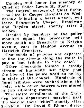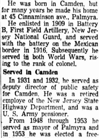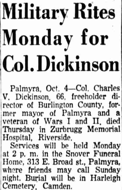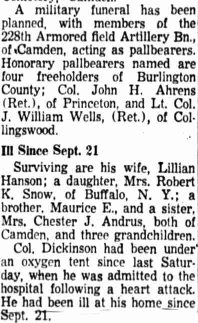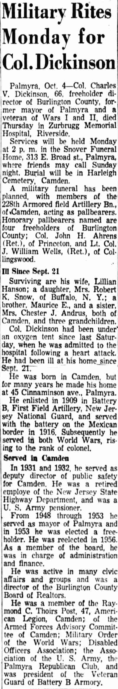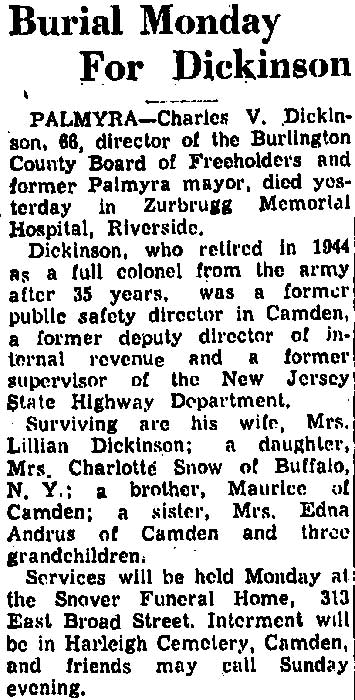 CHARLES V. DICKINSON was born July 26, 1891 to Lewis and Anna Dickinson. A veteran of World War I, by 1925 he had attained the rank of Major in the New Jersey National Guard, serving with the Headquarters Company of Second Battalion, 112th Field Artillery Regiment, which was stationed in the armory on Wright Avenue. The 1920 Census shows the family living at 570 Mount Vernon Street in South Camden. Besides Charles and his parents, the family included a brother, Mauroce Dickinson and sisters Lillian, Edna May, and Charlotte. Also residing at 570 Mount Vernon Street was brother-in-law Chester J. Andrus, who would go onto a long career with the Camden Fire Department. Charles V. Dickinson married Lillian Hanson at the age of 22. When the census was taken in April of 1930, Charles V. Dickinson, wife Lillian and daughter Charlotte were living with his parents at 570 Mount Vernon Street in Camden. Also living there was his sister Edna, her husband Chester J. Andrus, and Chester Jr., their son. Charles V. Dickinson was still with the National Guard at that point and was working as a foreman with the State Highway Department. He was named Public Safety Director for the City of Camden not long afterwards. This position took on added responsibilities as Chief of Police Lewis Stehr Jr. suffered a heart attack at the end of April and another on Thanksgiving. Chief Stehr died on December 10, 1930. Charles V. Dickinson served as the acting chief of the Camden Police Department, succeeding Chief Lewis Stehr Jr., as it was decided that a permanent chief would not be named until after the May 1931 election to decided Camden's mayor and city commissioners. He was succeeded in turn by Acting Chief John Golden. Charles V. Dickinson was still serving in a law enforcement role in Camden as late as October of 1932. He later moved to Palmyra, New Jersey where he served as Mayor for a time. He was later elected to the Burlington County Board of Freeholders. When the New Jersey National Guard was mobilized in 1940, Charles V. Dickinson was recalled to active duty. He was sent to Fort Sill, Oklahoma, where he served as inspector general. He had been promoted to full Colonel by war's end. Charles V. Dickinson was Director of the Burlington County Board of freeholders when he died in October of 1957. He was survived by his wife, daughter Mrs. Charlotte Snow, brother Maurice E., sister Mrs. Edna Andrus, and three grandchildren. |