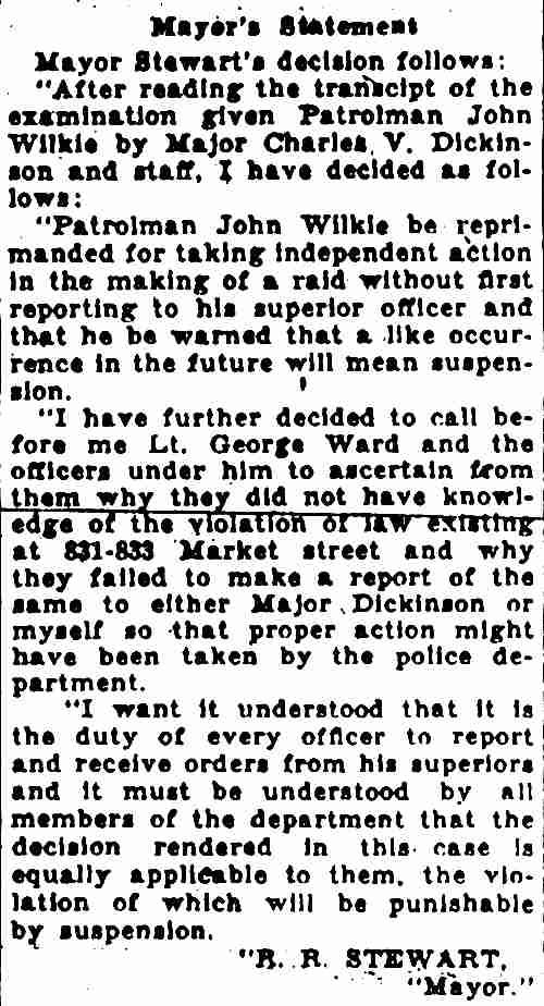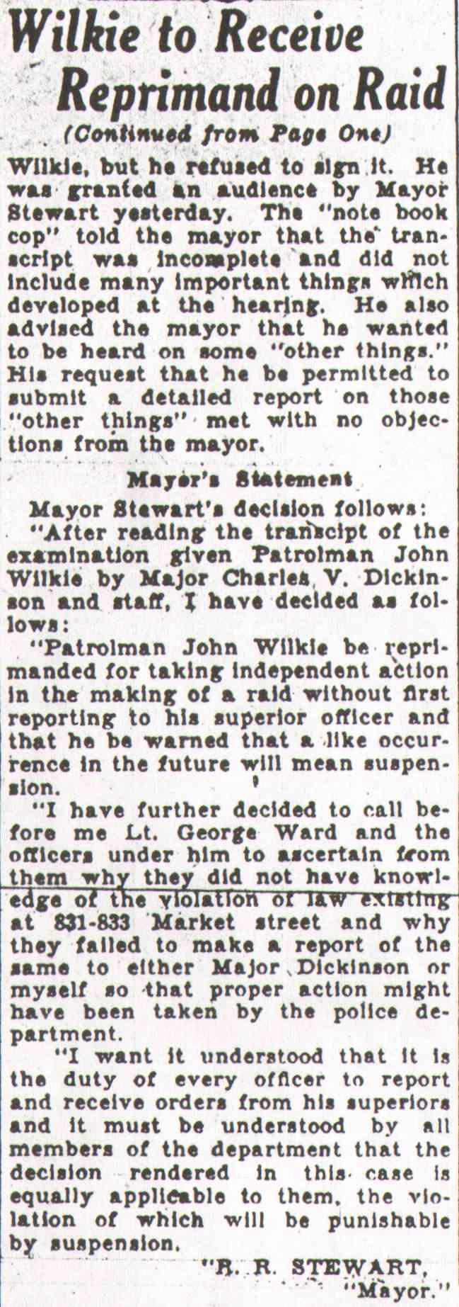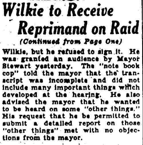 said he placed wilkie said he reported to police headquarters and that Major Charles V. Dickinson, deputy director of public safety, and Motorcycle Police Sergeant Jeff Kay and Policeman Nathan Wine searched and waited for hours for the return of the mysterious car without avail. |