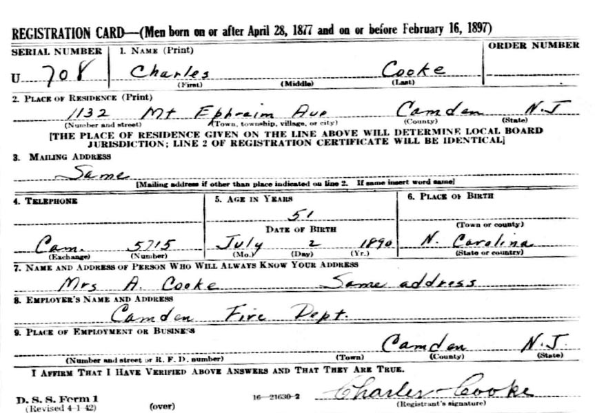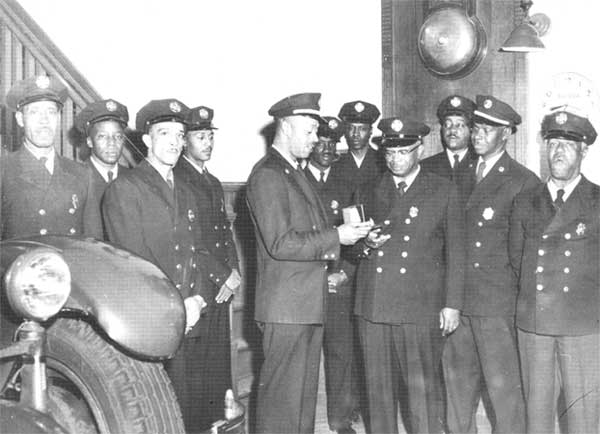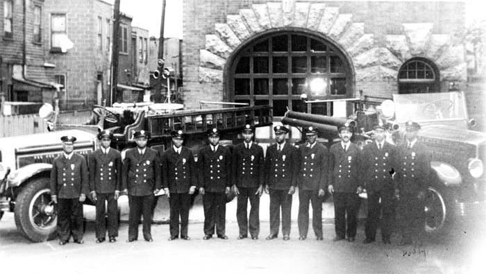 Circa 1949- Engine Company 1, wagon and pumper at front of quarters, South 4th & Pine Streets, South Camden. From left: Firemen Alfred Greene, Fred Henderson, Charles Cooke, Leroy Hatchett, Robert Thomas, Andrew Robinson, James Richardson, Eugene Alston, James Clinton, Captains Jesse Jones and Raymond Amos. |