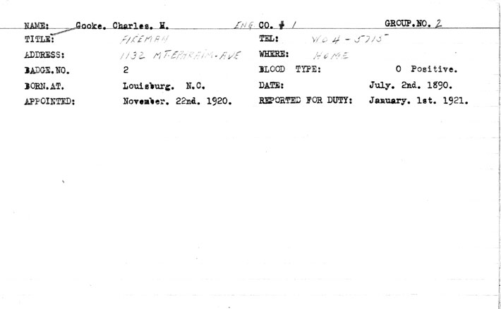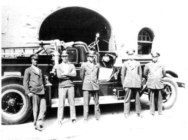 1953- Engine Company 1 with Hose Wagon at front of quarters, 1953. From left: Fireman Jesthroe Hunt, Fireman Charles Davis, Fireman Eugene Alston, Captain Jesse Jones, Fireman Charles Cooke. |