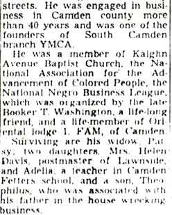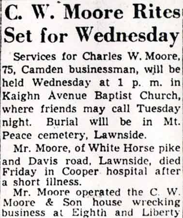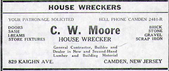 CHARLES W. MOORE was born around 1874 in North Carolina. He moved to Camden with wife Patsy and daughter Helen after her birth in 1900. Two other daughters, one named Adelia, and three sons followed, Charles, and twins Theophilus and Henry. By 1910 Charles Moore had establishing a demolition business in Camden at 829 Kaighn Avenue. By the time of the 1920 census, he had purchased a home at 822 Kaighn Avenue, across the street from the business at 829 Kaighn, where he sold second-hand building materials, gleaned from the buildings he had demolished. By 1930 he had moved to a home on the White Horse Pike at Davis Road in Lawnside NJ. Charles W. Moore was involved in many civic organizations in Camden. A founder of the South Camden Branch of the YMCA, the group had by 1947 located in his former home at 822 Kaighn Avenue. Charles Moore was also a member of the Kaighn Avenue Baptist Church, the NAACP, the National Negro Business League, and was a life-member of the Oriental Lodge #1, Free and Accepted Masons in Camden. Charles W. Moore died on January 13, 1950 after a short illness. He was buried on January 18 at Mount Peace cemetery in Lawnside. His sons continued to conduct the family business as late as the fall of 1955. |