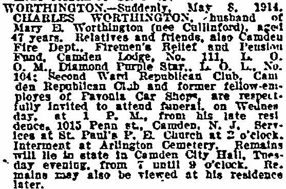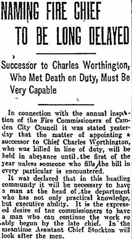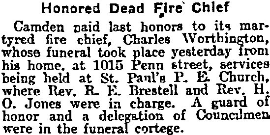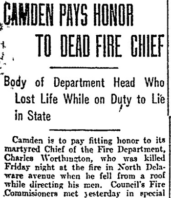 FIRE CHIEF KILLED FALLING OFF ROOF OF BURNING BUILDING Charles Worthington Plunges to Death from George Street Building and Was Found Face Downward With His Neck Broken by John Stockton and Others Dragging Hose in Blind Alley. Fire Chief Charles Worthington was killed last night in falling from the roof of the Camden Electro-Plating Company, at No. 12 George Street, while directing his men in fighting flames at the plant. The Chief’s neck was broken and his skull fractured. He died in a police ambulance on the way to Cooper Hospital. No one saw him fall, but it is surmised that he took the fatal plunge to avoid stepping on one of the many skylights in the roof. He fell into an areaway between two buildings and it is believed he lay in the alley at least five minutes before his senseless form was discovered. Not since the death of the lamented Chief of Police Foster has the city been so stunned by the passing of any of its officials. Although he had been head of the department but six months, succeeding Samuel S. Elfreth as Chief on November 1 last, Charlie Worthington had already demonstrated that he was the right man in the right place. Camden’s fire fighting force was making rapid strides forward under his leadership, and ion last night’s fatality the city loses one of its most efficient servants. On every hand there are heard expressions of keen regret and in the several firehouses deep gloom prevails. The men liked their Chief. He had risen through the ranks through sheer merit. He knew the needs of the men under him and they realize that in his untimely passing they have lost their best friend. In his little red flyer Chief Worthington was among the first to reach the blaze. There were three alarms, one by phone and two from boxes. The first box alarm came at 10:52 and the second seven minutes later. The electro-plating plant was on the second floe of the George Street building. The first floor was occupied by the New Jersey Automobile Supply Company. The building connected with the auto company’s main store which fronts on Delaware Avenue, thus making it an L-shaped affair. When the firemen arrived the upper floor of the building, or that section occupied by the electro-plating company, was a mass of flames, and Chief Worthington at once directed that the fire be attacked from the roof, ordering the lines of hose played on the blaze through the skylights. It was only the work of an instant to run up a ladder and the Chief, wearing his gum coat and rubber boots, was among the first to gain the roof. In a few minutes several lines of hose were in operation and the Chief was moving here and there giving general directions and trying to get a line on the progress of the flames. This was difficult matter because of the dense smoke which almost suffocated the men and made it necessary for them to move cautiously over the roof to avoid the very fate in store for Worthington. Leaving the men who were pouring tons of water on the flames through the skylights the Chief started over for the south side of the roof. That was the last seen of him alive. Several minutes later Assistant Chief Stockton and a detail of men from headquarters were pulling a line of hose through the blind alley between the auto company’s main building and the stables on the south when they stumbled over what appeared to be a man’s body. Reaching down in the darkness Stockton got hold of a rubber coat. He knew at once that one of the men had fallen. The suffering face was downward and not until he turned the body over did Stockton know it was his Chief. The dim rays penetrating a blackened lantern globe showed the Chief was badly hurt. His eyes were closed his head hung limp to one side and there was no response to the frantic appeals of the rescuers calling to their superior to tell them where he was hurt. Ripping open the Chief's rubber coat stockton placed his ear to the silent man's breast. Detecting faint heart beats he shouted to his comrades to summon an ambulance. While two or three ran to obey others aided Stockton in tenderly carrying the body to George Street. An ambulance which had come to the scene with the firemen was ready. Chief of Police Gravenor pulled a stretcher form under the seat and aided in placing his fellow Chief in the wagon, at the same time directing the crew, Stanton and Lewis, to make all possible haste to the hospital. The run was in vain. Hospital doctors took a look at the inanimate form and shook their heads. "The Chief's dead" one of them said, and tears dimmed the eyes of every man within the hearing of his voice. With the doctors Coroner Schroeder made an examination of the body and found that the neck and skull were broken. Undertaker John Crawford took charge of the remains and the unpleasant task of breaking the sad news to relatives in East Camden. Mrs. Worthington is prostrated with grief, at her home, 1016 Penn Street. two small children also survive. Harry R. Read, chairman of the Fire Committee of City Council, reached Cooper Hospital shortly after the ambulance arrived. He was visibly affected when told that the Chief was dead and for a few moments stood with bowed head. "This is terrible" said Mr. Read. "Camden has suffered a real loss and loses an ideal fire chief. I was very close to the Chief in his work and every move he made was for the best interest of Camden. He was conscientious in everything he undertook and was doing something every day to add to the efficiency of the force. Every man in the department realized that he was their friend. I can hardly believe that Charlie Worthington has gone." Mr. Read issued an order placing Assistant Chief Stockton in temporary charge of the department and called a meeting of the Fire Committee for 2:00 o'clock this afternoon to take action on the Chief's death. he also directed that all the engine houses and apparatus be dressed in black, that the flags be placed at half-mast, and that every fireman wear a badge of 