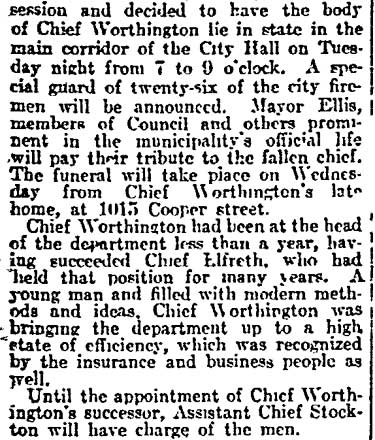 At a special meeting of the Fire Committee Saturday, the action of Harry R. Reed, the chairman of the committee, in ordering all the houses draped with mourning was approved. It was raised at the meeting that the widow was opposed to any public display. She was told that there should be some public recognition of her husband, who sacrificed his life while performing a public duty. Mrs. Worthington finally consented, and the committee arranged to have the body of Chief Worthington lie in state in the corridor of the Court House tomorrow evening from 7 to 9 o’clock.