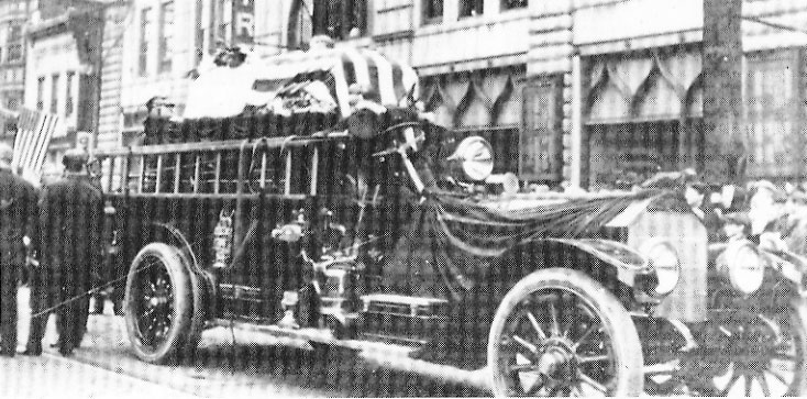 Fire Chief Worthington’s body will be borne to its last resting place in the new three-in-one apparatus recently added to the equipment. The apparatus is being fitted up to carry the casket bearing the remains of the beloved chief, who was killed in falling from a roof in Friday night’s fire.