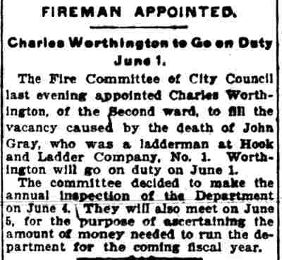 Mirror Altoona, Pennsylvania March 17, 1906 Charles Worthington recovered from his injuries, and became the Chief of the Camden Fire Department. Tragically, he to died while fighting a fire, on May 8, 1914. |