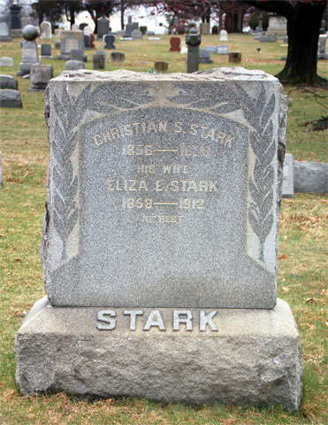 small problem when they were married. By 1927 Christian S. and Mary Stark had moved to 112 North 35th Street. Christian S. Stark died June 29, 1928. According to his obituary, he died at his home, 112 North 35th Street in East Camden. Other sources state he passed away in neighboring Pennsauken, New Jersey. He was buried at Bethel Cemetery in Pennsauken next to his first wife, Eliza. His son, Harry A. Stark passed in 1950, and was buried nearby, Margaret Lovett Stark joining him in 1954. |