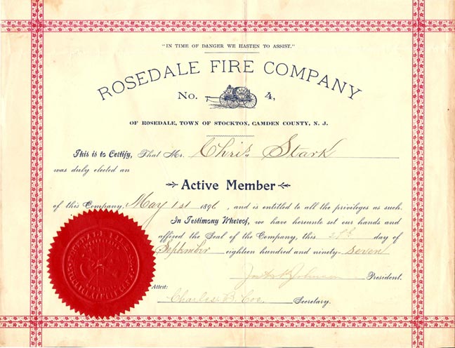 CHRISTIAN SAMUEL STARK SR. was born September 1, 1857 in Philadelphia to Henry A. and Rebecca Stark. He married Eliza E. Leech in the 1870s. By the time of the 1880 Census a son William Leech Stark had been born. Four more children would follow. sons Harry A., Grover C., Christian S. Jr., and a daughter, Margaret. Christian Stark Sr. first appears in Camden's City Directories in 1896, at 108 North 35th Street in the town of Stockton, with his wife Eliza and sons William L., Harry Alberger Stark., Christian S. Jr., and daughter Margaret. They appear to have had moved to Stockton in 1895, as son Grover Cleveland Stark had died in Camden on November 16, 1895. The City Directory states that Christian Stark then worked as a salesman in Philadelphia. More than likely he would have taken the trolley that ran down Federal Street into Camden and then crossed into Philadelphia via one of the ferries, the Market Street ferry being the most likely route. Christian S. Stark Sr. first entered fire service on May 1, 1896 as a volunteer with Rosedale Fire Company No. 4 in the town of Stockton, which then comprised what is known today as Cramer Hill and East Camden. Christian Stark was among the founding members of this company. In 1899 Stockton merged with the City of Camden. The Stockton fire companies remained in service until midnight on February 28, 1900 for a short time when companies at Camden's newly-built fire house on North 27th Street between Westfield Avenue and Federal Street went into service. A few of the Stockton firefighters became members of the City of Camden's professional department. Christian S. Stark, Elmer Ellsworth Stevens, and Robert Gick were of that number. Christian S. Stark in time was promoted to Captain in June of 1911, taking the place of Edward Weston, who had retired due to a line of duty injury. By 1914 he was Captain of Hose and Chemical Company No. 2, quartered at North 27th Street and Hayes Avenue. On January 1, 1924 this unit was renamed Engine Company 11, and stationed at the same location. However, it appears that Captain Stark retired in 1923. Christian
