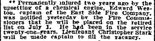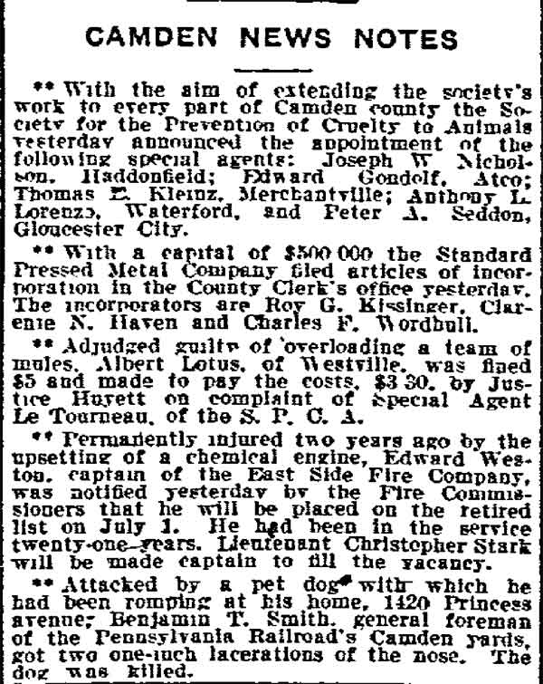 Christian S. Stark, former Camden city fireman, died of pneumonia last night at his home 112 North 35th Street. He was 71. Stark suffered from a weak heart, and recently caught cold, which developed into pneumonia. He was well known in East Camden, where he resided for the past 32 years. He is survived by his wife Mary Stark, and several children. The deceased was a member of the fire company for about 23 years and went on pension about five years ago. He was Captain of Engine Company 11, stationed at 27th Street and Hayes Avenue, East Camden. He was a member of Trimble Lodge No 117, F. and A.M., and of the Firemen's Relief Association of Camden. Funeral Services will be held 2 p.m. Tuesday at his residence, Interment will be at Bethel Cemetery. |