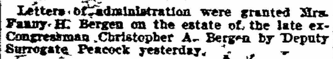 function of the Both of the brothers are pronounced Republicans, though neither is an active politician. Christopher A. in 1884 was the choice of a large section of his party for the position of State Senator, but declined making any effort to secure the nomination. He was elected president of the Camden County Republican Club in 1886. Martin V. Bergen has also been named as a candidate for legislative honors, but has held no offices of consequence other than the school superintendency.. |