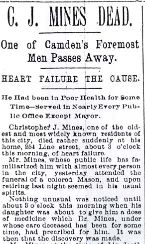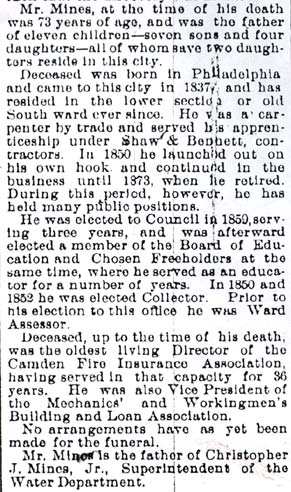 CHRISTOPHER J. MINES SR. was born around 1822. He came to Camden in 1837 from Philadelphia, settling in South Camden. A carpenter by trade, he went into business for himself after having served an apprenticeship for the contracting firm of Shaw & Bennett . He remained in business until retiring in 1873. Active in civic and political affairs, Christopher J. Mines Sr. was elected to City Council in 1850, serving three consecutive terms. He subsequently was simultaneously elected to the Camden County Board of Chosen Freeholders and the Camden City Board of Education. He was also the city’s collector, being elected to that office in 1850 and in 1852. In 1859 he joined the Board of Directors of the Camden Fire Insurance Association, and served on that board until the time of his passing. He also was vice-president of the Mechanics and Workingmen’s Building & Loan Association. The 1880 Census shows Christopher Mines Sr. living at 254 Line Street with his wife Sarah and three of their eleven children- George, Kate, and Henry. He was then working as a “house inspector”. Christopher J. Mines Sr. was a member of the William B. Hatch Post No. 37 of the Grand Army of the Republic, also known as the G.A.R. Christopher J. Mines Sr. died at his home, 254 Line Street , on the morning of October 7, 1895 at the age of 73. Among his survivors were at least one daughter, Rachel Mines Milliette, and at least two sons, William W. Mines, and Christopher J. Mines Jr. Both had long and distinguished careers in Camden civic affairs. Christopher Mines Jr. was the Superintendent of the city of Camden’s Water Department at the time of his father’s death. Grandson Dr. Marcus K. Mines, son of Christopher Mines Jr., practiced medicine in Camden for many years. |
