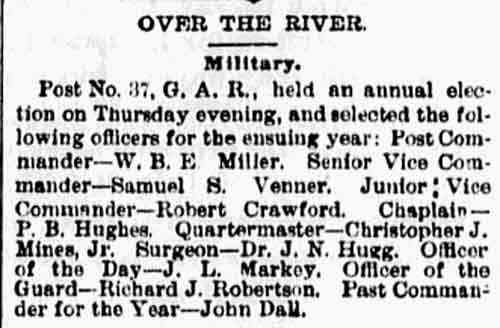 Venner - Robert Crawford Presmel D. Hughes - Christopher J. Mines Jr. - Dr. I.N. Hugg J.L. Markey - John A. Dall William B. Hatch Post No. 37, G.A.R. |