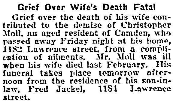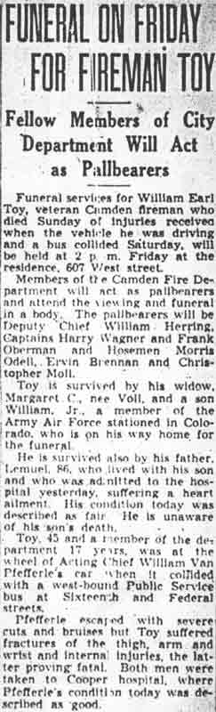 Middleton Felled by Gas In House Here With gas flowing from a pipe detached from a gas range, former City Commissioner Melbourne F. Middleton, Jr., was found unconscious in the kitchen of his former home at 538 Cooper street early Saturday night. Middleton was reported last night to still be in a critical condition at West Jersey Hospital, where he was taken. The Camden Fire Department First Aid Squad worked over him for an hour at the house in a vain effort to revive him. Middleton, a former president of the Philadelphia Stock Exchange, and one time city councilman, was found by a son, C. Barry Middleton, and a friend, John Williams Rossell, who lives with the Middletons on Laurel road, Moorestown. Middleton was clad in overalls and two large pipe wrenches were lying on the kitchen floor near him. Young Middleton said his father told his family he intended to take up some linoleum in the kitchen of his former home. Middleton first went to his office Saturday and then to St. Paul's Episcopal Church to a service. From there he was traced to his former home, which is owned by him. When Middleton failed to return home for dinner at the usual time Saturday his son and Rossell decided to search for him. When young Middleton discovered his father's plight he notified police. Patrolmen Frank Cavallo, Henry Lutz, walter vecander and George G etley responded in radio cars and gave first aid until the fire department squad arrived. The firemen worked on the former commissioner one hour with an inhalator before ordering his removal to the hospital, where they continued to work on Middleton for another hour but were unable to revive him. Hospital physicians continued working on him without success. They said his condition was critical. Gas Man Called At 4 p. m. Saturday the family living next to Middlemen's home telephoned Public Service that gas was coming from the house. Public Service sent a man to investi-gate but he was unable to get into the house. Young Middleton and Rossell said they reached the house at 6.17 p. m. While he was a member of the first city commission Middleton was director of finance but never missed responding to all alarms of fire. He was a member of the fire committee while serving in City Council as a member from the Second ward. In that capacity he also answered all alarms. Members of the Firemen's First Aid Squad responding to the call were Deputy Chief William R. Harring, Hosemen Christopher Moll, william spencer, Harry Haines, Russell Anderson, william harry deitz and Nelson Andrews. City Detectives benjamin simon, Joseph Mardino and William Marter are investigating the cause. |