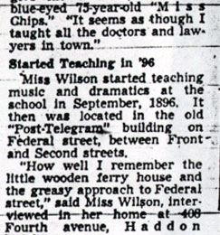 since February 23. Miss burrough began her teaching career in Cooper School. Later she was transferred to Fetters School and in November, 1894, she became a teacher in Camden Manual Training and High School, then located at 125 Federal Street. She was appointed principal of the high school in 1900. |