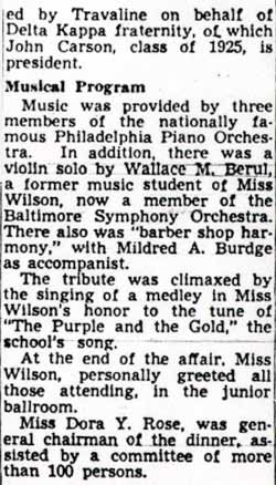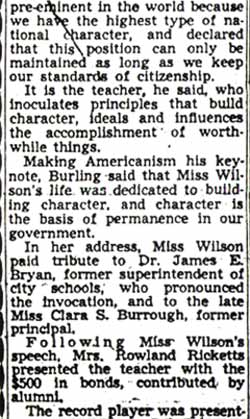 News of her death cast a somber pall over the gala school closing; students, school board members, fellow teachers and thousands of alumni who can sincerely state they owe much of their success to Miss Burrough, were grief-stricken by the tragic news.