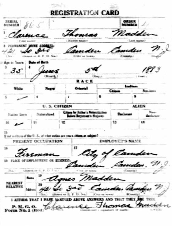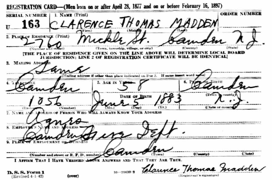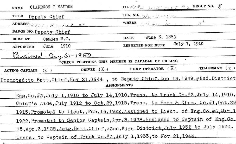 CLARENCE THOMAS MADDEN was born June 5, 1883 to Thomas and Winifred Madden. The 1900 Census shows the Madden family living at 11 South 3rd Street, between Federal Street and Taylor Avenue. His father owned a bar at that address. Besides Clarence there was an older sister, Anna, and a younger brother, Walter Madden. Another sibling had died prior to the census being enumerated. The family moved a few houses away, to 21 South 3rd Street shortly after the Census was taken. The 1906 City Directory shows Clarence Madden working as a clerk, and living at 21 South 3rd Street. He was still at that address when the 1914 City Directory was compiled. Clarence Madden was first appointed to the Camden Fire Department on July 1, 1910, and served with Engine Company Number 2, stationed at 5th and Arch Street. Camden's Fire Department was still using horse- drawn equipment when he began his service. When he registered for the draft September of 1918 Clarence Madden was living at 421 South 3rd Street. He and his wife Agnes and his widowed mother Winifred were living there in January of 1920 when the Census was taken. By 1924 he had moved to 2760 mickle Street in East Camden, not far from the fire station at 27th and Federal Street. In 1922 Clarence Madden was raised to Lieutenant, and on April 3, 1928 was promoted to senior captain of Engine Company 6. Clarence Madden was named battalion chief on November 21, 1944 and deputy chief of the Camden Fire Department on December 16, 1949. His last assignment prior to retiring was as the fire commander for the Second Fire District, based at North 27th Street & Federal Street . Chief Madden lived at 2760 mickle Street into the early 1950s.. Deputy Chief Madden applied for his pension in July of 1950, a mandatory retirement at 65 law having been passed covering police and firemen. His last day on the fire department was August 31, 1950, when he retired along with Firemen John Prucella, Spencer Smith Sr., and Frank L'Esperance. By 1959 he had moved to 635 Eldridge Avenue in Oaklyn NJ. Clarence Madden passed away in May of 1963. He was survived by his son Clarence T. Madden Jr. |