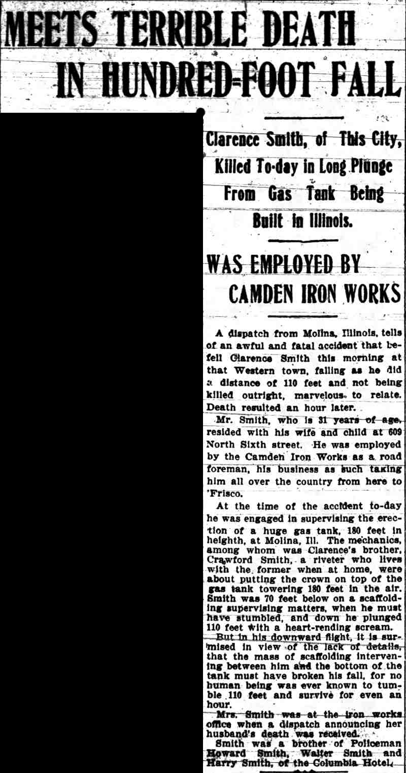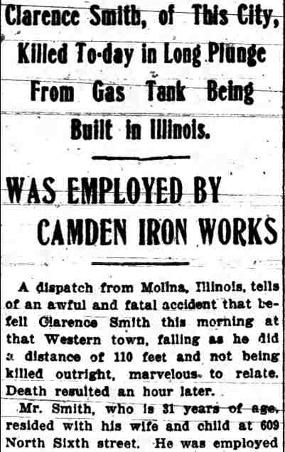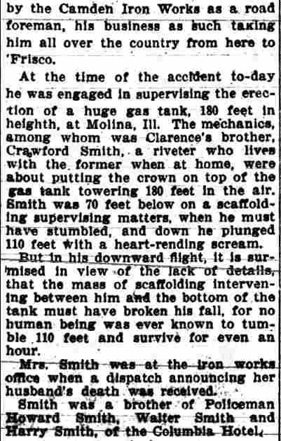Sadly, Clarence S. Smith was killed when he fell from a 40 foot tall