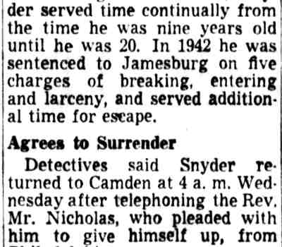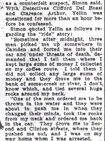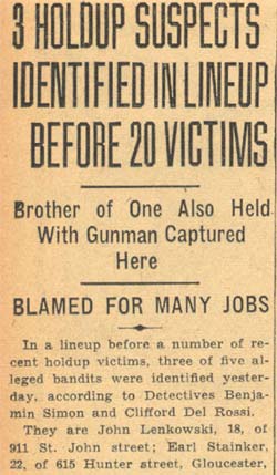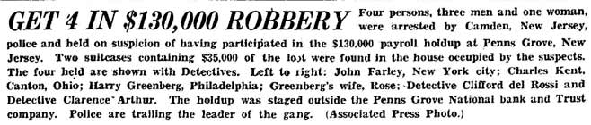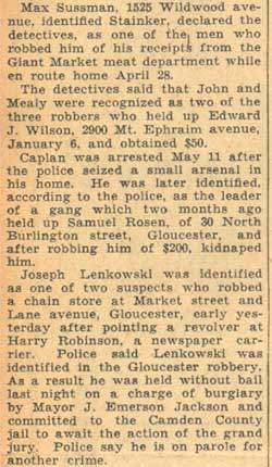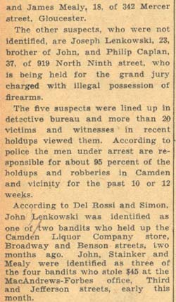 The $11,790 payroll holdup staged last Friday at the Radio Condenser Co., Thorne and cope wood streets, was, re-enacted yesterday. Two suspects nabbed late Monday, at Lykens in Dauphin County, Pa., played the "heavy" roles. Also in the cast were eight women and two men, employees of the firm. For an hour and 20 minutes the spectacular robbery was "rehearsed" under the direction of three Camden detectives. When the curtain was, rung down LeRoy Jenkins, 23, who police say has addresses at 1161 Mechanic Street and 1220 Princess Avenue, and joseph putek, 23, said to reside at 1462 Louis street, were held on sus picion. They will be questioned further today. Has Nothing Definite Acting Chief of Police John W. Golden admitted he "has nothing on the boys." Detectives Benjamin Si mon, clarence arthur and Clifford Del Rossi, however, "were pressing pursuit of "hunches" and meager clues in attempts to solve the crime. There were several lines of information they obtained regarding the two suspects which will bear further study, si mon said. Putak, who has a po1ice record al though never convicted according to police, was questioned previously in connection with the Radio Condenser "job." He was released at midnight last Saturday. After that the detec tives centered attention upon Jenkins. They learned Jenkins borrowed an automobile from a man who operates a garage in the 1200 block on Atlantic Avenue. The garage man was reluctant to talk but under threat of arrest as an accessory he admitted lending a car to Jenkins. Fliers were dispatched to police throughout Pennsylvania, New York, Delaware and New Jersey. The car was halted at Williamsport, Pa. and when Camden police were identified they were surprised that Putak was Jenkins' companion. This stirred de tectives to renewed vigor in the probe. They learned the men were planning to visit relatives, of Jenkins in Williamsport and Pottsville. According to si mon police of both cities say Jenkins is well known to them. While at Williamsport the three de tectives learned Putak and Jenkins visited a vice den and quarreled with a woman over money. They quoted Jenkins as declaring that he "could buy and sell the joint!' Had Little Money Putak had but $3 when released Saturday and $11 when arrested, si mon revealed. He told the detectives he had won money in a poker game here. The two men were returned with the detectives as far as Philadelphia but refused to cross the river. They were turned over to police there on suspicion and. brought to this city yesterday afternoon. Taken to the Radio Condenser plant they were confronted with the ten employees who were herded in a vault during the holdup last Friday. According to si mon several of the employees felt there were certain mannerisms of the suspects which corresponded with actions of the bandits but confessed they were unable to definitely identify Putak or Jenkins as the heavily masked pair who threatened their lives with a revolver and shotgun. . The detectives propose an inquiry to al1 banks in this area in an ef fort to learn whether safe deposit boxes were leased by anyone answering the description of the suspects. The money obtained in the robbery was in bills and change of small de nomination, numbers of the bills were not available. Although never convicted Jenkins has a police record. Putak has never been formally under arrest, but has been questioned by the police in connection with various cases. Jenkins was arrested December 18, 1931, charged with larceny of gaso line, and on last July 9 was charged with several robberies. On April 2, 1931, he was held for the grand jury, charged with man slaughter after his automobile killed Mrs. Mary Cavanaugh, 70, a cook in the service of City Solicitor e. G. C. Bleakly. |