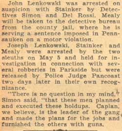 HOLDUP AT RADIO PLANT Two Camden youths, released from Camden county jail, were held by local police yesterday on suspicion of implication in the $11,790 holdup of the Radio Con denser Company, Thorne and cope wood street s, last Friday. They are Leon Grinkewicz, 18, of 1469 Louis Street, and Stanley Geda, 19, of 1273 Whitman Avenue. Although both denied knowledge of the payroll holdup, detectives said they admitted having been close pals of Le Roy Jenkins, 23; of 1161 mec hanic Street, and Joseph Putek, 23, of 1462 Louis Street, who were arrested in Lykens, Pa., on Monday. Grinkewicz and Geda are being held on suspicion but, according to Detectives clarence arthur ; Benjamin Si mon and Clifford Del Rossi , they will be charged today with being material witnesses, while Jenkins and Putak will be charged with the holdup and will be arraigned in police court. Grinkwicz and Geda were arrested yesterday morning on their release from county jail. They had been committed May 9 by Recorder Joseph Patton, of Haddon Heights, for 30 days on charges of loitering with in tent to steal. They were questioned all day by detectives. Detectives said they learned Jenkins and Putak were with Grinkewicz and geda in Haddon Heights "to do a job" but that the other two dis appeared when Grinkeicz and geda were arrested. Although they were in the county jail at the time, the detectives said they learned they had participated with Jenkins and Putak in planning the Radio Condenser job five weeks ago. |