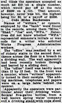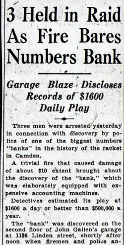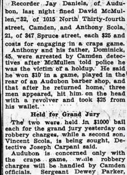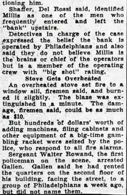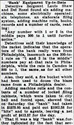 STORE RAIDED BY ‘SECRET6’ SQUAD Raiders of the “Secret 6” of the Camden police department yesterday arrested Oscar Bendler, 40, as the alleged proprietor of a cigar store at 217 Market Street, where they reported hey seized horse racing sheets, three phones and $114. Bendler, who gave his address as 310 Erie Street, is charged with violating the city ordinance prohibiting gambling and is held in $500 bail for a police court hearing today. The raid on Bendler’s place was made after the police squad had searched five other small shops and found only legitimate business being conducted, Two of the shops were located on the Market Street ferry walk, two on Market Street between Second and Third Street and on Federal Street between Second and Third Street. Fine-combing of establishments were it is suspected the gambling gentry may flourish was ordered by Police Chief Arthur Colsey. The picked squad of men who operated as members of colsey's ”Secret Six” yesterday were Detective Sergeant Clifford Del Rossi, Sergeant Walter Rowand, Detectives Benjamin Simon and joseph mardino. |