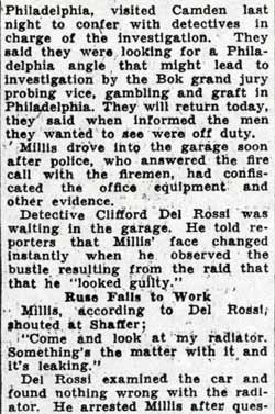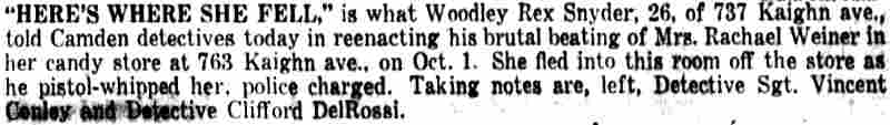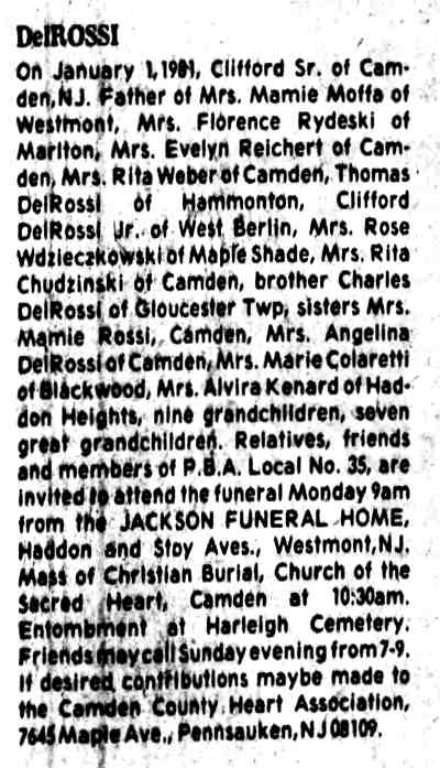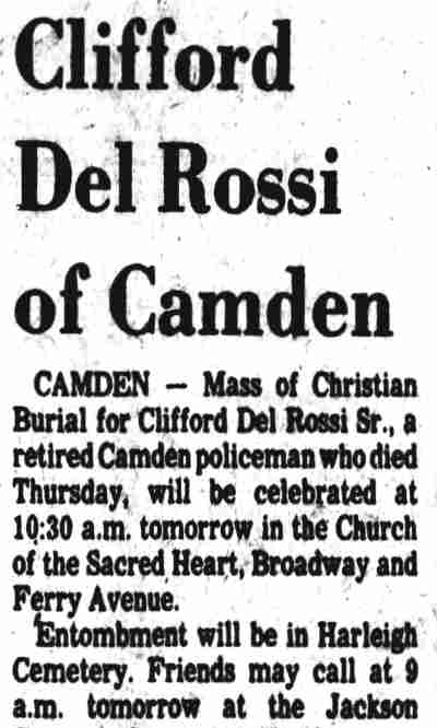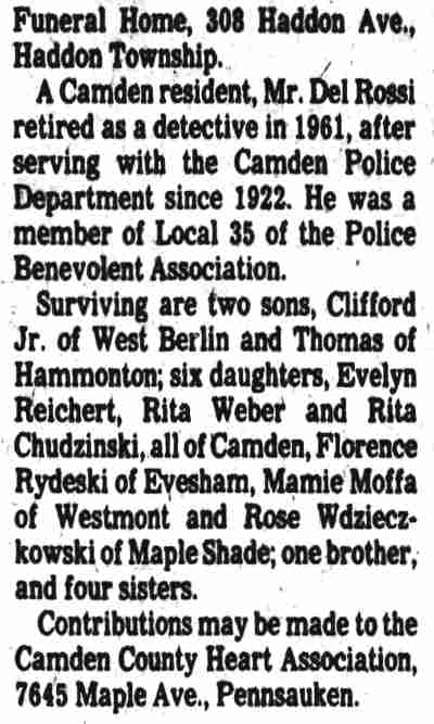 CLIFFORD DEL ROSSI was born June 21, 1896, in Pennsylvania, one of at least nine children born to Angelo and Mary Del Rossi. The family had moved to Camden by 1910, when they lived at 1904 South 4th Street in Camden's Eighth ward, where Angelo worked as a laborer on the railroad. Clifford had already left school, working odd jobs to help the family. Sisters Clara and Raphaella worked as "spinners" at the nearby Howland Croft & Sons Company mill. By 1916 Clifford Del Rossi had wed, and by January 1920 with wife May owned a home at 420 Emerald Street. The 1920 Census lists his occupation as "under foreman" at a woolen mill, most likely also the Howland Croft & Sons Company mill. On July 10, 1922 Clifford Del Rossi started working for the Camden Police Department. The 1930 Census shows that Clifford Del Rossi was working for the Camden Police Department. At that time he was a widower, his wife having passed shortly before the census. At that time the Del Rossi family had moved around the corner to 417 Winslow Street in Camden's Eighth Ward, across the street from the Howland Croft, Sons & Company plant. Clifford Del Rossi was at that time raising his seven children, ranging in ages from 2 to 12 years of age. Next door at 419 Winslow was the Scarduzio family, and the Di Carlantonio family lived at 423. Both of these families had members who would become well known in the neighborhood and the city in future years. Clifford Del Rossi rose in the ranks of the Camden Police Department, and by February of 1934 was serving as a detective. In his early years as a detective he appears to have been partnered with Detective Benjamin Simon. Detective Del Rossi's picture was on papers across the country in that month when he, with Detective Clarence Arthur, took part in the arrest of four people suspected of having staged a $130,000 payroll robbery in Penns Grove NJ. The 1947 Camden City Directory and the 1959 New Jersey Bell Telephone directory show Clifford Del Rossi living at 1324 Jackson Street in Camden. While he does not appear in Directories from 1970 forward, he remained a Camden resident. Clifford Del Rossi died in January of 1981. His son, Clifford Del Rossi Jr., also served as a member of the Camden Police Department in the 1960s and early 1970s.. |