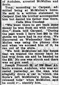 Detectives He Called Saps Turn Tables on Suspect Anthony Gibbons, 35, of 1332 Decatur Street, has learned that calling detectives saps is a very "sappy" remark to make- he is now in the city jail on charges of possessing stolen goods. Last Wednesday the automobile of John Harwan, of 1317 Sheridan Street, was stolen from Van Hook Street and Mt. Ephraim Avenue. It was recovered Thursday with four wheels and tires missing. Charles Reynolds, of 1331 Van Hook Street was arrested and sentenced to six months. Gibbons, was suspected of having the wheels and, tires. He was questioned Thursday night and released by Detectives Benjamin Simon and Clifford Del Rossi after denial. The two detectives then heard via the "grapevine" that Gibbons called them "saps." So they shadowed him all day Saturday and discovered him making several visits at the home of Vito Balducci, 1329 Decatur Street. An investigation of the cellar of Balducci's home revealed the missing tires and wheels. Simon and Del Rossi said that Balducci was an innocent party to the crime and did not know Gibbons had placed the articles in his cellar. Michael Reggiero, of 327 Sycamore Street, told the detectives he saw Gibbons taking the tires and wheels into the house while Balducci was out.. |
