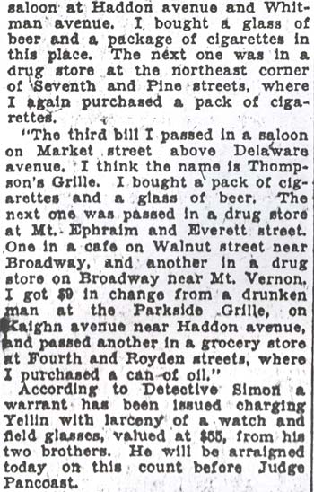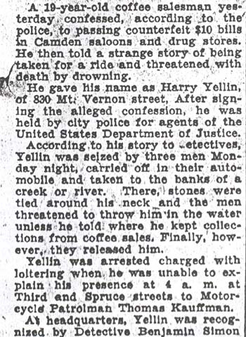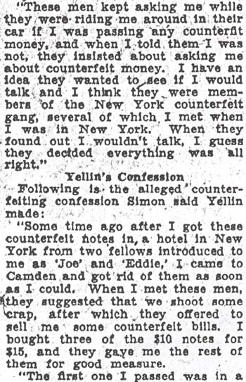 Coincident with police warnings throughout South Jersey for merchants to be on the look-out for spurious $10 and $1 bills, a man and woman were arrested in Philadelphia yesterday as suspected members of a ring flooding South Jersey with counterfeit notes. Two others are under arrest, taken into custody Saturday night at Somerdale after they allegedly passed counterfeit $10 notes on three storekeepers. The two arrested yesterday have been identified as the man and woman who fled in an automobile when the other two were apprehended at Somerdale. All four are colored. A fourth man is being sought. Meanwhile fake bills have ap-peared in Camden and Ocean City. Three spurious $1 bills were passed in Ocean City and a $1 and $10 bills in Camden. Were Passing Tens State police with the Berlin Barracks, who provided Philadelphia police with the clue resulting in the arrest of the man and woman, declared the four colored persons apparently devoted themselves to passing false tens. The four are David and Estelle Mitchell, both of 623 South Seventeenth street, Philadelphia, arrested at that address yesterday; Carlton Hollen, 37, of 2519 West Turner street, Philadelphia, and Thomas E. Sprinkles, 38, of Emlen Avenue, Lawnside. All four will be arraigned here tomorrow morning before U. S. Commissioner Wynn Armstrong. Alertness of Mrs. Bella Mitchell, storekeeper on Evesham avenue near a colored amusement park, and that of two Somerdale policemen, resulted in arrest of Hollen and Sprinkles. Mrs. Mitchell called Police Recorder Edward C. Ziegler and Policeman Charles W. Rush, to examine a counterfeit bill which she said one of the group had given to her. Man and 'Woman Flee A few minutes later the party returned, and Zjegler and Rush attempted to arrest them. One man and the woman fled in an automobile while Ziegler pursued the other two men around the Mitchell home. One man escaped through a woods at the rear of the property, but Rush arrested Hollen. Sprinkles, who had been seen with Hollen, was detained as a suspect. In the meantime, a call to the Berlin state police barracks brought Troopers Sol Polkowitz and Nicholas Torrell, at whose suggestion the men were taken to the Berlin State police barracks and questioned. No counterfeit money was found on either man. Sprinkles was arrested after Trooper Torrell had found a wad of counterfeit $10 bills lying on the ground. Mrs. Mitchell, Mrs. Elizabeth Showell, Evesham Avenue, and Mrs. Gertrude Gross, Warwick road, identified Hollen as the man who had given them counterfeit bills, after having been introduced by Sprinkles. They identified Mitchell and the Jones woman at Philadelphia city hall. The prisoners were then turned over to the United States Department of Justice. A teletype message sent out by Berlin state police, containing the license number of Mitchell's car, CV453, led Philadelphia detectives to Mitchell and his woman companion. The four are being questioned by U. S. Department of Justice agents as to whether they circulated any of the false notes in Camden. Cigar Dealer Duped Detective Clifford Del Rossi, assigned to counterfeit activities in Camden, disclosed yesterday a spurious $10 note had been passed upon Charles Goldberg, cigar merchant at 433 Broadway, and that Goldberg was unaware of being duped until he had given the note to Detective John Schimer in exchange for scrip. Schimer learned of the bill’s spuriousness when he deposited at the Camden Safe Deposit and Trust Company with $20 in genuine money. Goldberg made good the note to Schimer. One of the many counterfeit $1 bills being circulated found its way to the circulation department of the Courier-Post Newspapers. When compared to a genuine note the printing on the bill was indistinct. It was shorter by a quarter of an inch than the real issue and the outline of George Washington's face was dim. The bill was turned over to Camden police. The three $1 bills passed in Ocean City, all of which are in hands of police there, were made with faulty engravings which depict Washington needing a haircut and with a front tooth protruding. Two men arrested in Atlantic City yesterday as counterfeiters of half dollars were held for the U. S. grand jury last night by U. S. Commissioner Herbert Voorhees. They are Theodore Osbern, 26, who gave his address as Richmond, Va., and William Carey, 27, of 315 Drexel avenue, Atlantic City. They were arrested by Constable A. H. Frankel at 500 North Tennessee Avenue after a man told him the two had sought his aid. Frankel said the men were starting to pour molten metal into molds when he arrived. |