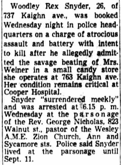 HELD IN THREAT AS WOMAN FAINTS Landlord, Seeking Rent, Denies He Intended to Shoot Tenant Residents along the 900 block on Howard Street were thrown into a turmoil at 9:15 a.m. yesterday by a reported shooting, after a woman, screaming for help, ran from her home and fainted on the street. The police arrested Charles Bensley, 73, of 936 Howard Street, charged with threatening to kill Mrs. Anna Morgan, 55, of 934 Howard Street, and carrying concealed deadly weapons. A few minutes later Police Judge Pancoast held Bensley without bail for the grand jury. He admitted having the pistol at the hearing, but. had denied possession of the weapon when first arrested. "Were you going to shoot her?" the court asked. "No,“ Bensley replied, "I don't know what made me do this, I think I'm half-crazy. I own the house and wanted to collect the rent or make her move." When Motorcycle Patrolmen Russell Young and George Getley arrived in front of Bensley's home, 100 neighbors were crowding the street outside. Bensley, they said, eluded them and ran out the front door after pretending to make for the back. He was grabbed by August Hasher, 41, of 217 Erie street, a bystander. Meanwhile, a motorist had taken the unconscious Mrs. Morgan to Cooper Hospital when she fainted in front of. her home. She was questioned at the hospital by Detectives Clifford Del Rossi and George Zeitz. The detectives quoted Mrs. Morgan all saying that Bensley, who owns the house in which she lives, came into her home this morning to talk about rent which was two months overdue. "He asked me," she said, "if I had received a court notice to move, and I said I had, but was waiting for an eviction notice. "Then he said, 'Well, I'm going to take the law in my own hands', and with that he pulled out a pistol and began brandishing it. I ran out the front door calling for help and then I fainted. That‘s all I remember." Bensley admitted asking Mrs. Morgan to move out. The police found a 38-caliber revolver and a box of bullets hidden behind a rafter in the cellar of his home, they said. |