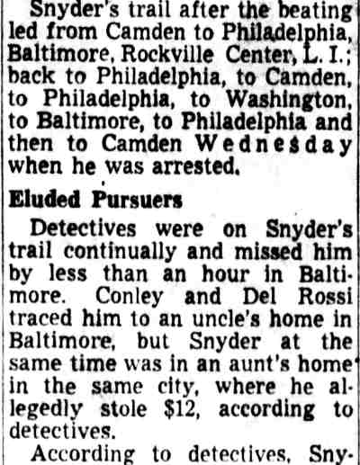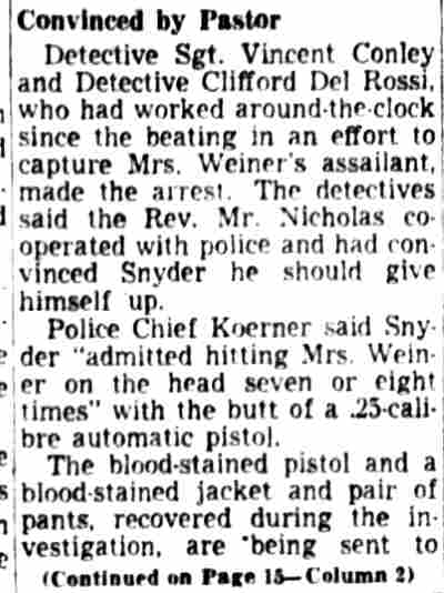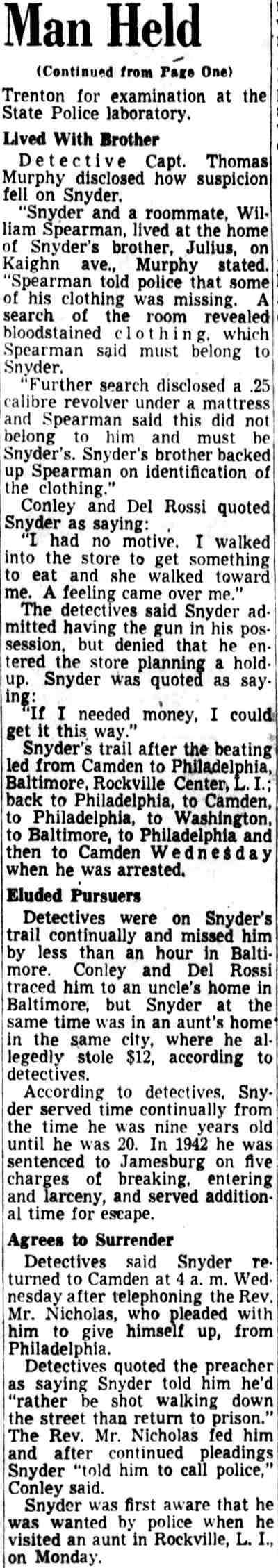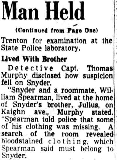 SLAIN BY JAGGED GLASS, HUSBAND HELD A death-bed command of a South Camden mother to her four children to stick to their story failed of its motive last night and the woman's husband was arrested on suspicion of murder. The charge will be changed today, police said, to one of murder. "Say only what I say, that I fell down the steps." Mrs. Philomena Marcozzi, 4l, died in West Jersey Homeopathic Hospital shortly after she made that remark; at 4 p.m. yesterday. She bled to death from a severe cut on her left arm. At her bedside were her children, Josephine, 15; Ida, 13; Louise, 17, and David, 19. Cops' Suspicions Aroused Nearby Out of sight of the dying woman, stood Detectives Clifford Del Rossi and Fiore Troncone. Their suspicions aroused, the sleuths renewed their investigation. As a result the woman's husband, Guilio Marcozzi, 55, of 321 Pine Street was put in the city jail last night, charged with the death of his wife. Mrs. Marcozzi was cut with the jagged edge of a broken wine decanter, during an argument with her husband over the cleaning of some hardshelled crabs. But it wasn't the children who said that. A neighbor, Mrs. Ida Lupini, 31, of 311 Line Street, was in the Marcozzi home when the children returned Sunday night from a crabbing trip to Sea Side Heights. She told police, they declared, that she saw the children jubilantly deposit their catch on the kitchen table. Then she watched, alarmed and afraid to leave, as Marcozzi told his wife to "throw them out." The wife refused. The husband insisted, and when his wife told him he should clean the crabs, he grasped the wine decanter and struck the mother over the temple, Mrs. Lupini said. Cut by Jagged 'Glass' The decanter broke. Grasping the long, neck of the bottle, Marcozzi continued to attack his wife. He swung the jagged edge towards her breast, and to protect, herself she raised her arm. The broken bottle cut deeply into her skin. An artery was severed. Then the children rushed, the mother to West Jersey Homeopathic Hospital. That is the story Mrs. Lupini told: according to Acting Chief of Police John W. Golden and Assistant Prosecutor Rocco Palese. The mother told hospital attaches she fell down the steps of her, home, cutting her arm on the broken bits of a bottle she was carrying at the time. The children, hearing this story, corroborated her. Wife Dying- Man at Work The father failed to appear at the hospital. Police were forced to get him at his work yesterday, according to Detective Joseph Carpani, when his wife was dying. Last night he denied the crime. He said he was not at home when his wife suffered the fatal injury. But his children, confronted with Mrs. Lupini's tale, broke down and confessed, according to police. Eighteen hours of almost constant questioning of the Lupini woman by Detectives carpani, del rossi and troncone solved the tragedy. All three were complimented last night by Acting Police Chief john w. golden. |