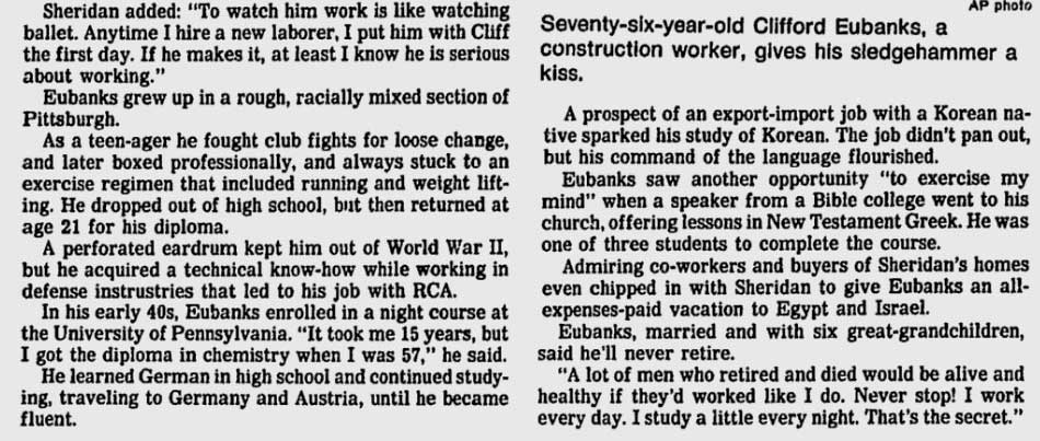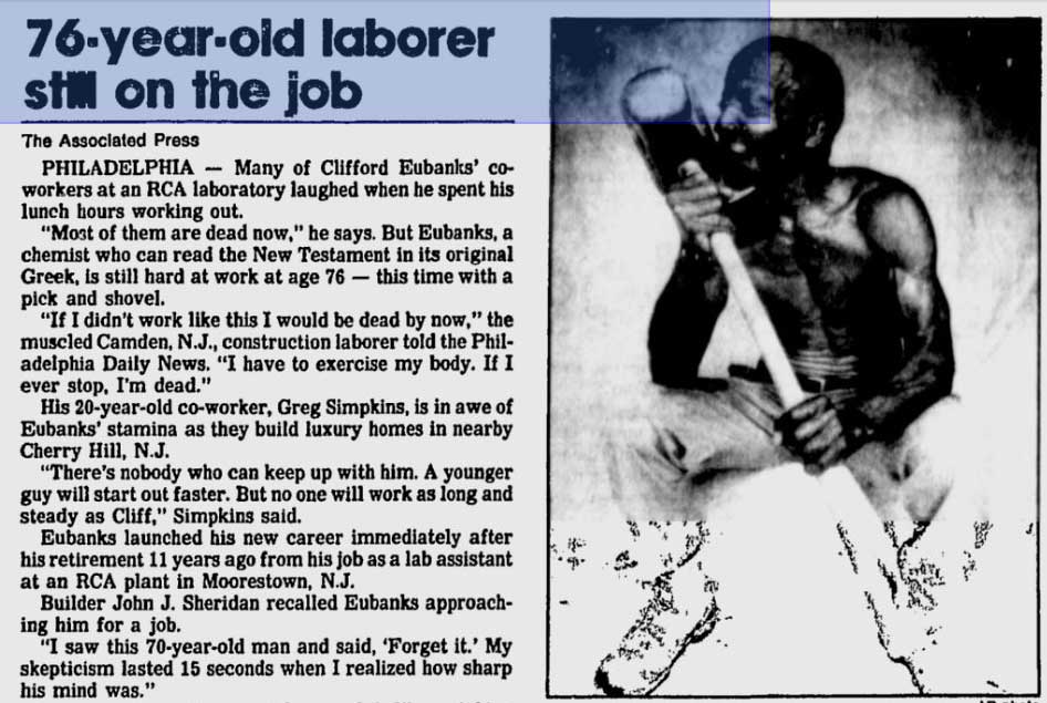 Clifford Eubanks retired from RCA at the age of 65, and went into a second career as a construction laborer. Always physically fit, he was still on the job into his late 70s. He also became fluent in German, Korean, and New Testament Greek.