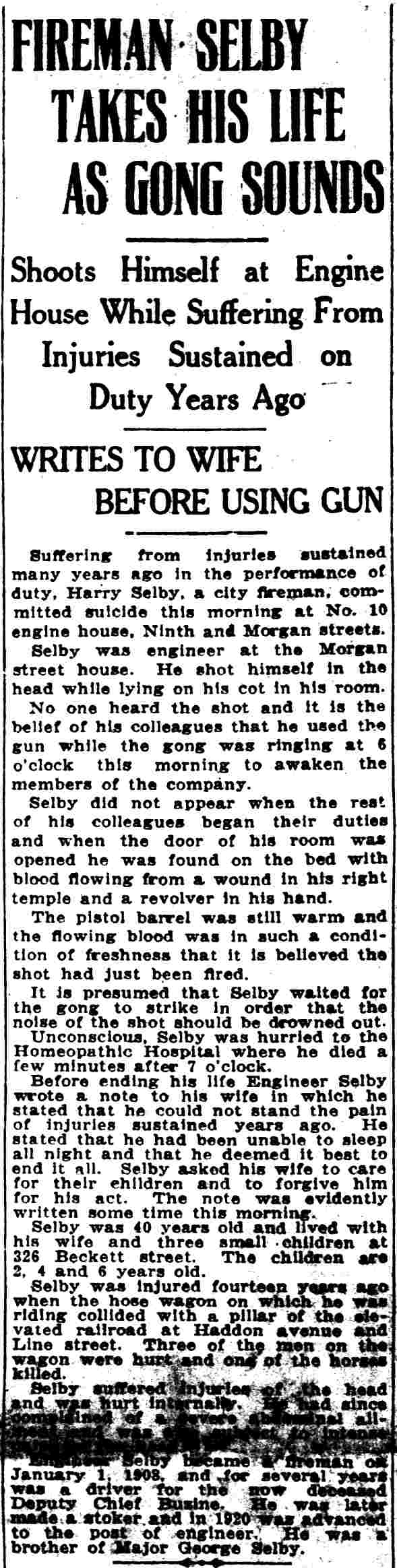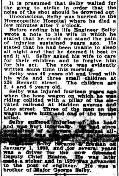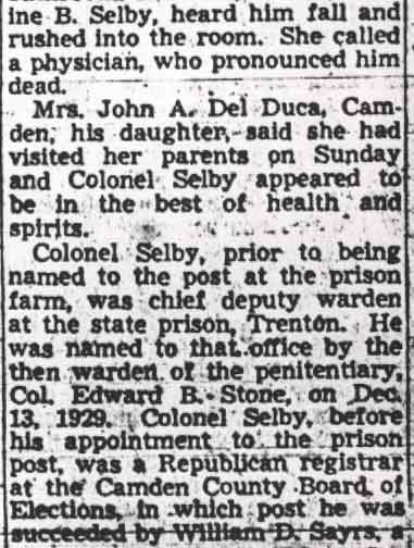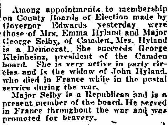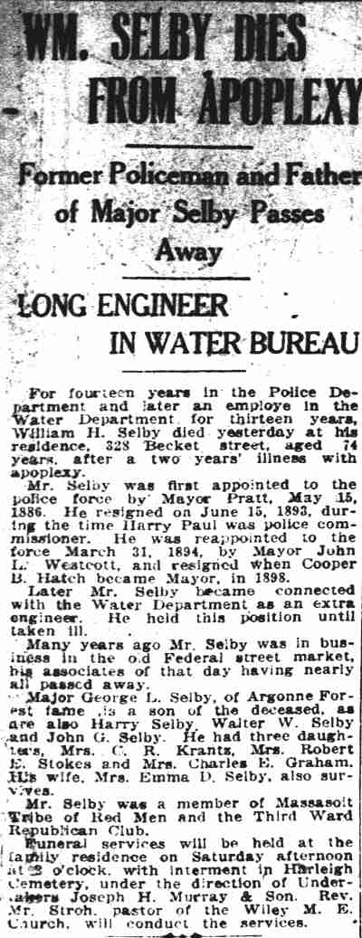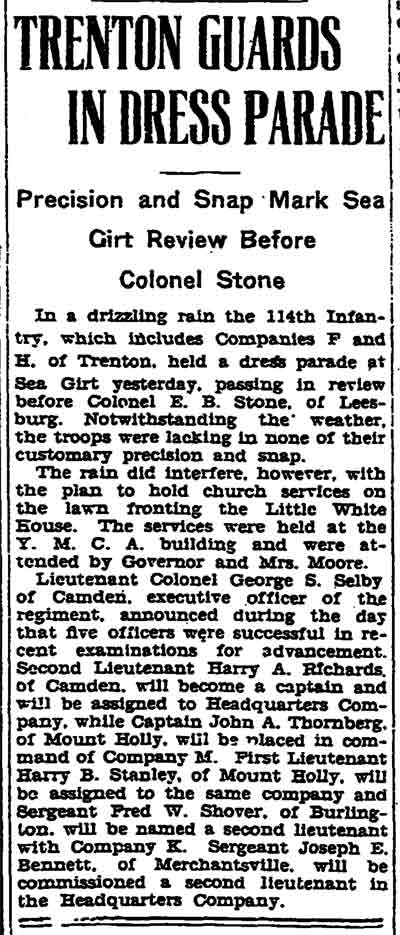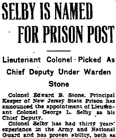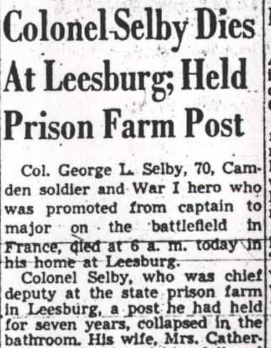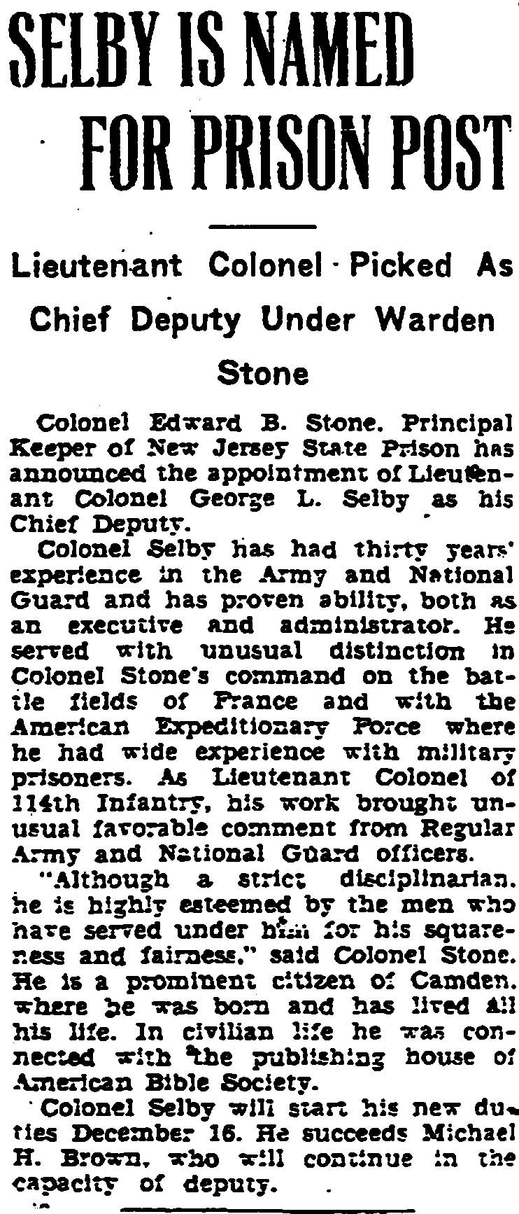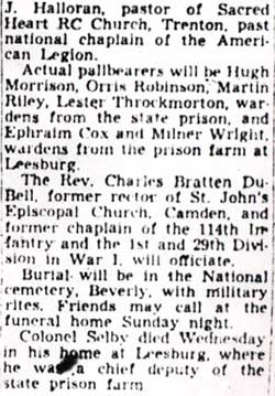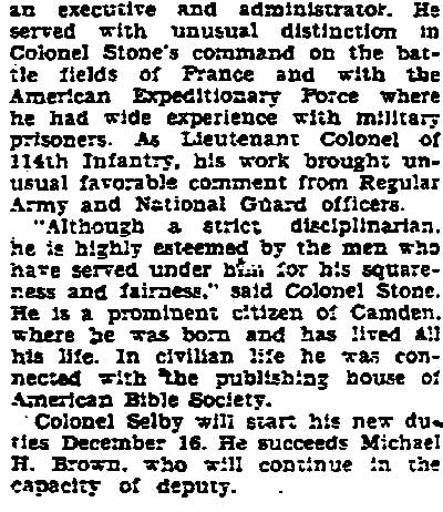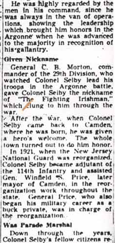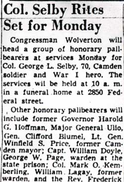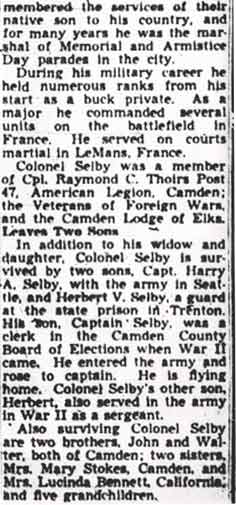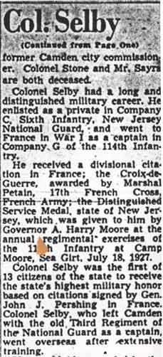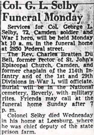 COLONEL GEORGE LAWRENCE SELBY was born June 14, 1879 in Camden, New Jersey to William Henry Selby and his wife the former Emma Dunn Gibbon. He was the third of nine children born to the Selbys, coming after brother William H. (1875-1876) and sister Elizabeth M. (1877-1882). He was followed by Harry (1879-1923), Mabel (1884-1948), Mary E. (1997-1953), Walter W.(1891-1974), John G. (1895-1969) and Dorothy (19800-1974). His father was active in Republican politics and served with the Camden Police Department for 14 years, and later with the Water Department. Both George and younger brother Harry Selby were somewhat active politically and involved in the early 1900s with Company C, Third Regiment, New Jersey National Guard. George L. Selby was still active with the Guard when the United States went to war in 1917 and served heroically at the Battle of the Argonne Forest, and served the public for many years after his return at war's end. He married Catherine Malloy around 1902. Five children were born to the Selbys between 1903 and 1912. As stated above, he had remained in the National Guard, and by the time America entered World War I in April of 1917, he had risen to the rank of Captain. He went overseas as the Captain of Company G, 114th Infantry Regiment. 29th Infantry Division. He was promoted to Major for his heroic actions during the Battle of the Argonne Forest, and to Colonel in the New Jersey National Guard after war's end. Among the troops he led in Company G were Sergeant James E. Reynolds of Camden NJ, Corporals William S. Hey and Charles Albert Mathews of Camden, Privates Townsend C. Young and Frederick H. Baynes, of Gloucester City, private walter tucker of Haddonfield, and Private Samuel J. Reichard of Camden. Colonel Selby returned to Camden after the war, and was given a hero's welcome. He was appointed adjutant of the New Jersey National Guard by General Winfield S. Price, who later became Mayor of Camden. Colonel Selby also worked as the Republican registrar at the County Board of Elections during the 1920s, when he was succeeded by William Sayrs, a former Camden city commissioner. On December 13, 1929 Colonel Selby was appointed Deputy Warden of Trenton State Prison in Trenton NJ by Colonel Edward R. Stone. During this time the Selby family lived at 1409 Third Street in Trenton NJ. He held that post until 1943, when he was transferred to Leesburg State Prison in Leesburg NJ, where he served in a similar capacity. Colonel Selby for many years was the marshal of Camden's Memorial and Armistice Day parades. He was a member of the Raymond C. Thoirs Post 47 of the American legion, the Veterans of Foreign Wars, and the Elks Lodge in Camden. George L. Selby passed away at the age of 70 at his home at Leesburg NJ on May 17, 1950. After services at the Harry Leonard Funeral Home at 2850 Federal Street in Camden, he was buried with full military honors at Beverly National Cemetery in Beverly NJ on May 22, 1950, where he now rests next to his wife Catherine, who joined him in March of 1960. George Selby's brother, Harry Selby, was a member of the Camden Fire Department from 1908 until his tragic death in 1923. |