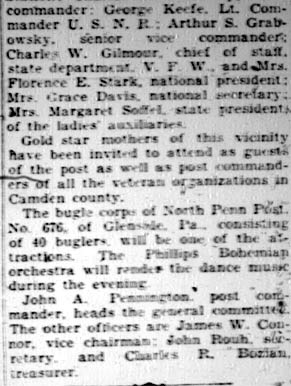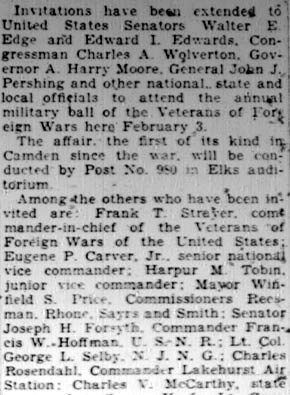 SPANISH WAR VETERANS INSTALL 1928 OFFICERS Mayor Price was among the speakers last night at the annual installation of officers of General John A Mather Camp, No. 39, United Spanish War Veterans, held at 114th Regiment Armory, Haddon Avenue and Mickle Street. Other speakers were Colonel George L. Selby, in charge of the permanent registration bureau, Senator Clifford R. Powell, Burlington County, and Postmaster Charles H. Ellis. Mayor Price said plans will be made for the erection of an All-Wars Memorial building, similar to that in Atlantic City. Officers installed were: Robert Riley, commander; Harry Rose, senior vice commander; Harry Todd, junior vice commander; Edward Bearint, adjutant; John J. Doyle, quartermaster; John Buel, guard; Lenny B. Orr, chaplain; Edward Daves, instructor; Edward Phifer, color bearer; PO.C. McCormack and Frank Tomlin, trustees; John Pierce, sergeant major. |