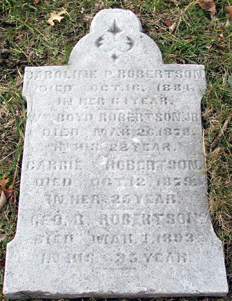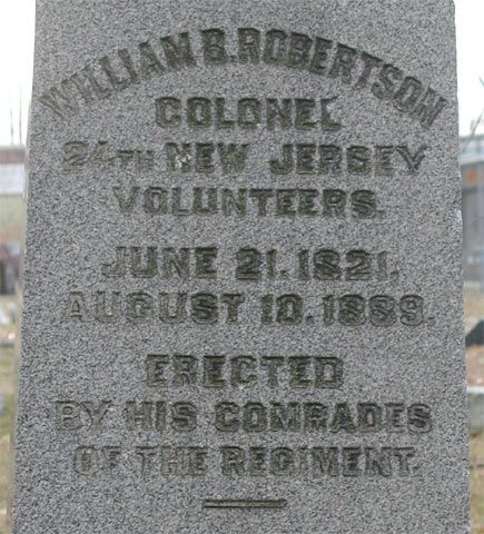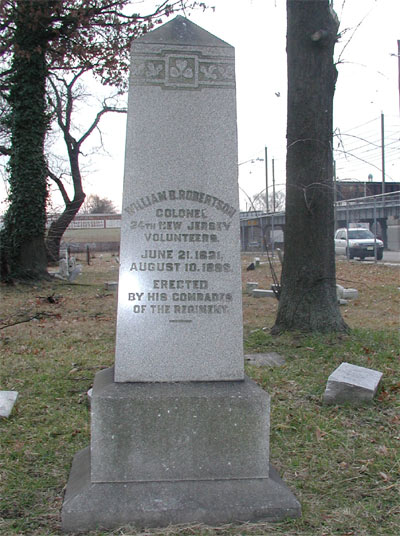 COLONEL WILLIAM BOYD ROBERTSON was born June 21, 1821 in Scotland. By the mid 1840s William Robertson had married and settled in Salem NJ. Oldest son Robert was born their around 1847. William B. Robertson was in business as a druggist at that time, and was still following that trade when the next census was taken. The 1860 Census for Salem NJ lists William and Caroline Robertson and their six children, Robert, Henry, Agnes, William Jr., Caroline, and George. He commanded the 24th Infantry Regiment, New Jersey Volunteers during the Civil War. During the War Between the States, William B. Roberton answered his country's call. He enlisted as the Colonel on September 12, 1862, and was commissioned as commanding officer of the Twenty-fourth Infantry Regiment, New Jersey Volunteers on September 16, 1862 at Camp Cadwalader in Beverly NJ. The Twenty-fourth Regiment was one of eleven regiments raised in response to President Lincoln's call for 300,000 troops to serve for a nine-month's enlistment. The Twenty-fourth arrived in Washington DC on October 1st, 1862. The Twenty-fourth Regiment was placed in the Provisional Brigade of General Carey's division. On December 9th they reached the Rappahannock opposite Fredericksburg, and was transferred to the First Brigade, under Brigadier General Nathan Kimball, part of Major General William H. French's Third Division, Second Army Corps. During the December 13th, 1862 assault on Fredericksburg, the raw troops of the Twenty-fourth Regiment advanced nearer the Confederate defenses than any other command save the Irish Regiments, and paid for that ground grievously, losing 160 killed and wounded. George Reeser Prowell wrote of the Twenty-fourth New Jersey's actions at Fredericksburg in the 1880, "They held the ground tenaciously until relieved, but even then were compelled to seek refuge in and about the burning buildings where, prostrate on the earth, they were exposed to the shot and shell." Company D lost three killed and twelve wounded during this battle. Captain Aaron Ward was shot through the lungs, a wound that for most in the Civil War would have proved fatal. He was fortunate and made a full recovery. The Twenty-Fourth New Jersey Regiment went into camp for four months after Fredericksburg. On April 2, 1863 copies of the "Peace Resolutions" which had been passed by the New Jersey state legislature, reached camp. Mass meetings were held where the soldiers in Prowell's words, "indignantly denounced" them. On May 3rd, 1863 the Twenty-Fourth New Jersey Regiment took part in the Battle of Chancellorsville. During that action forty men were either killed, wounded or listed as missing. The Twenty-Fourth New Jersey Regiment mustered out of service on June 29, 1863 at Beverly NJ. Upon leaving the Army, William B. Robertson returned to Salem NJ. At the time of the 1870 Census he was running a china store in that city. The Robertson family had moved to Camden NJ by the late 1870s. Sadly, two of the Robertson's children died prematurely. William Jr. died at the age of 28 on March 26, 1878. Daughter Carrie died October 12 of the following year, and was only 25 at the time of her passing. When the census was taken in 1880 the Robertson family resided at 16 Hudson Street in Camden. William B. Robertson was employed by the Pennsylvania Railroad. Son Henry worked for the Pennsylvania Railroad as a deck hand on one of the ferry boats which the firm operated, while son George also worked for the Pennsylvania Railroad, as a watchman. A daughter, Agnes, aged 29, resided at home as well. During the 1880s William B. Robertson was a member of the William B. Hatch Post No. 37 of the Grand Army of the Republic. On October 16, 1884 Caroline Robertson passed away at the age of 61. Colonel Robertson is listed in the Camden City Directories for 1887-1888 and 1888-1889. His residence was 840 Federal Street, which was the Presbyterian Mission and his occupation in both editions was salesman. Also listed in both directories at 840 Federal Street is an Emma L. Robinson, a teacher at the school which operated with the mission. Colonel Robertson passed away August 10, 1889. He was buried at Old Camden Cemetery on Haddon Avenue. The men who served with and under Colonel Robertson got together and had a large monument erected in his name. Colonel Robertson's surviving son, George, died Mar 1, 1893 at the age of 35. |