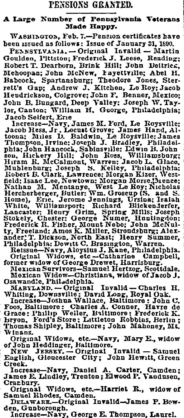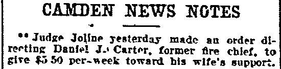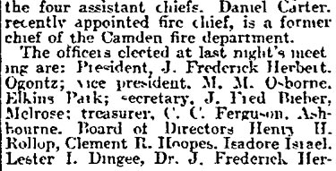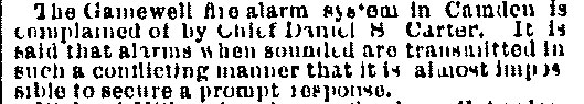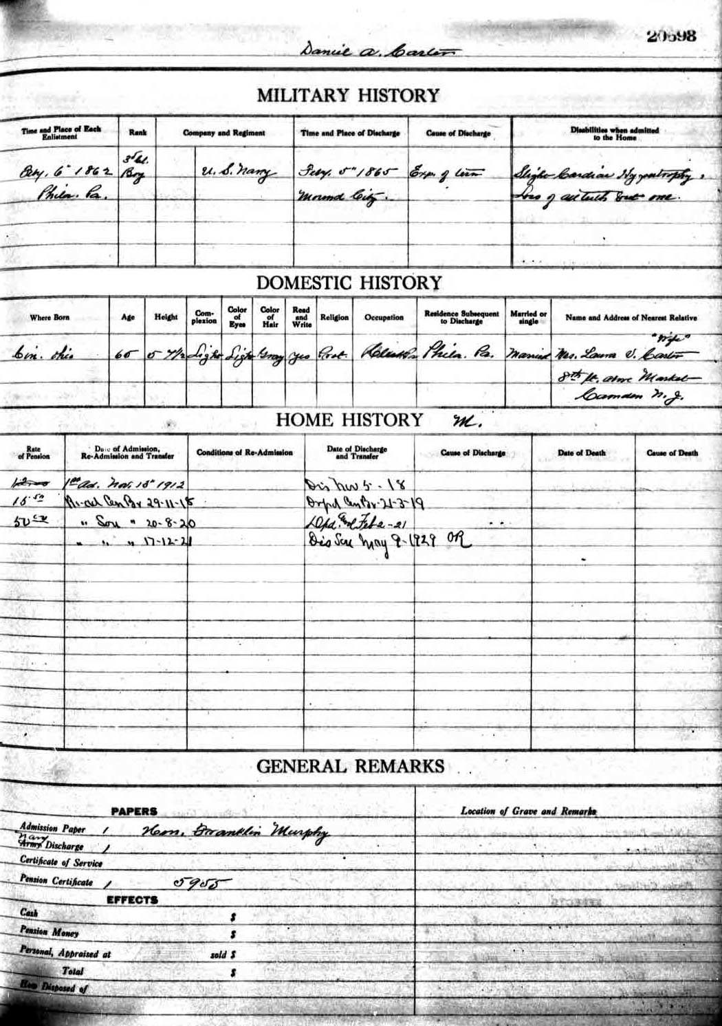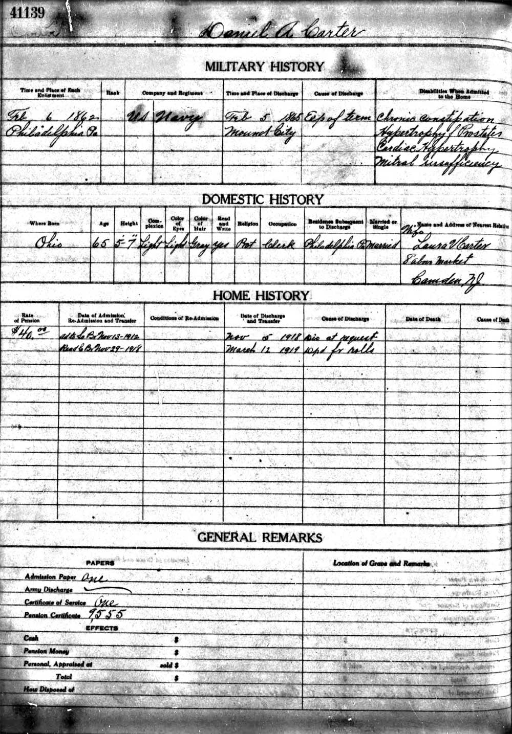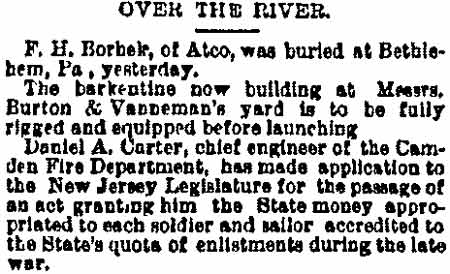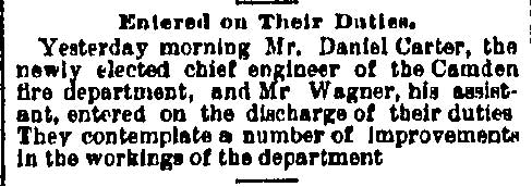 DANIEL A. CARTER was born in Cincinnati, Ohio on January 31, 1847 to Nathaniel Carter and the former Mary Beck. Daniel A. Carter enlisted for a three year term in the United States Navy at Camden on February 6, 1862. He was discharged at Mound City, Illinois on February 5, 1865, having completed his service. By the 1880s he was receiving a pension from the United States government for his Civil War naval service. On January 31, 1890 he was granted an increase in his allotment, which was reported in the local press on February 8. Returning to Camden after the Civil War, Daniel A. Carter entered the world of commerce and to an extent, politics. He married Laura V. Horner in Camden on October 29, 1876. Six children were born of this marriage- Mabel in 1877, Frank B. in 1880, Helen V. in 1883, Eva M. in 1890, Laura in 1892, and Estella in 1895. Sadly, Frank and Eva died as babies and Helen did not see her ninth year. The Carters are listed in the 1878-1879 City Directory at 731 Federal Street. Peter Carter the worked as a commission merchant. The family remained at that address through 1885. The 1880 Census shows them living at the home of Laura's parents, Thomas and Lizzie Horner, 731 Federal Street. Also living at the Federal Street address was Laura's brother, George Horner, who had been a member of the Camden Fire Department for several years in the 1870s. Daniel A. Carter was elected Chief of the Camden Fire Department in 1882, replacing Samuel S. Elfreth. He served for three years, Elfreth being returned to office in 1885.. The 1887 and 1888 Camden City Directories shows Daniel A . Carter at 733 Federal Street. He was then working as a solicitor for the West Jersey Railroad, which by 1888 had become the Camden & Amboy Railroad. By 1894 Daniel A, Carter had moved to 737 Federal Street. He changed jobs three times in this period, directories giving his occupation as bookkeeper (1894), salesman (1896), and insurance (1898). The 1900 Census shows the Daniel Carter and family living with his in-laws at 737 Federal Street. He was still selling life insurance at the time of the Census. Also residing at that address was his brother-in-law, George Horner, then a Camden police officer. Sadly, by 1903 Daniel A. Carter and his wife had separated. He was living in Philadelphia by 1906. Ill health plagued Daniel Carter's later years. He was admitted to the U.S. National Home for Disabled Volunteer Soldiers in Dayton, Ohio on November 18, 1912. On November 5, 1918 he checked himself out, but was readmitted on November 29th. He again left the home on March 21, 1919. The 1920 Census shows that Daniel A. Carter was living and working as a librarian at the United States Naval Hospital in Philadelphia. However, he was readmitted to the Home for Disabled Volunteer Soldiers on August 20, 1920, where he remained, except for a 15-day period in February of 1921, until May 9, 1929. It is not known at this time when and where Daniel A. Carter passed away. Records indicate that he did not die at the Home for Disabled Volunteer Soldiers. He died on January 3, 1930 and was buried at Colestown Cemetery in Delaware Township (present-day Cherry Hill), New Jersey. |